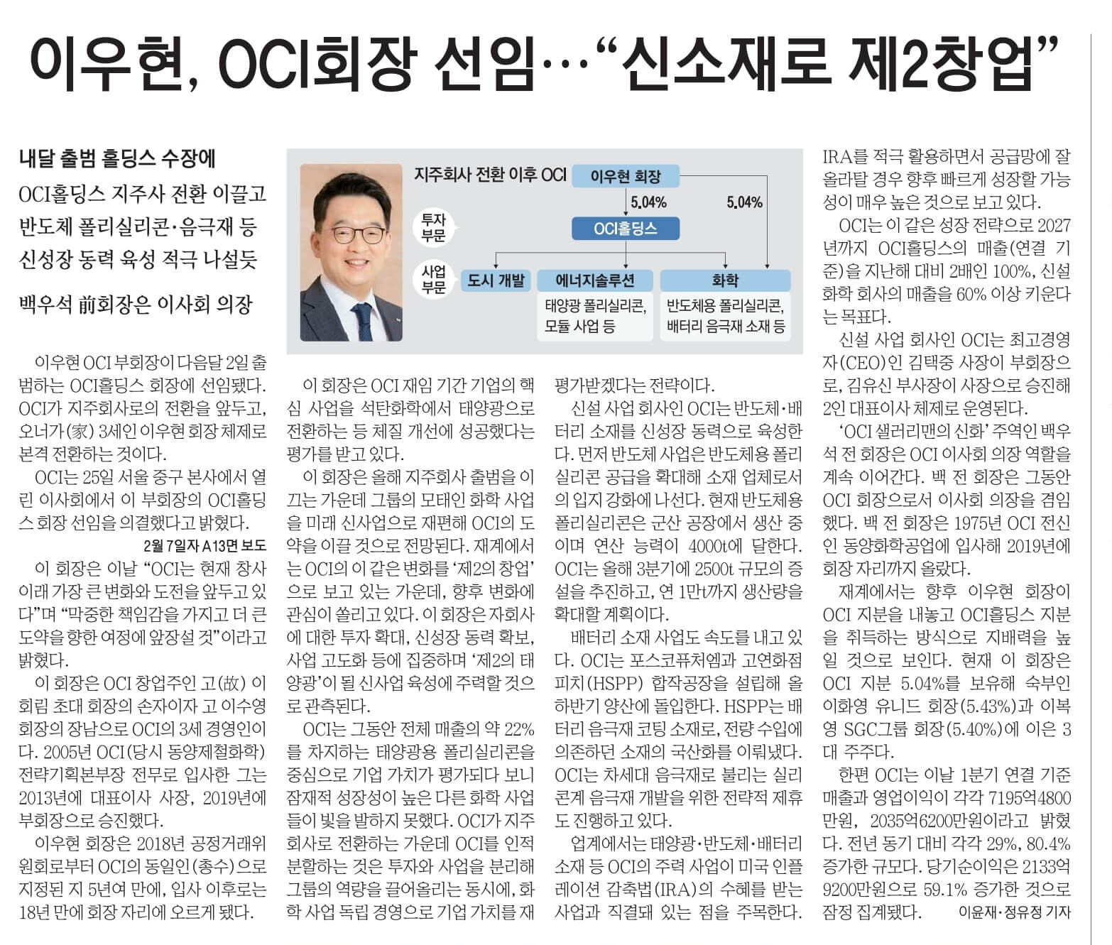 ☞ 이우현, OCI회장 선임…"신소재로 제2창업"...내달 출범 홀딩스 수장에...OCI홀딩스 지주사 전환 이끌고...반도체 폴리실리콘·음극재 등...신성장 동력 육성 적극 나설 듯...백우석 前회장은 이사회 의장