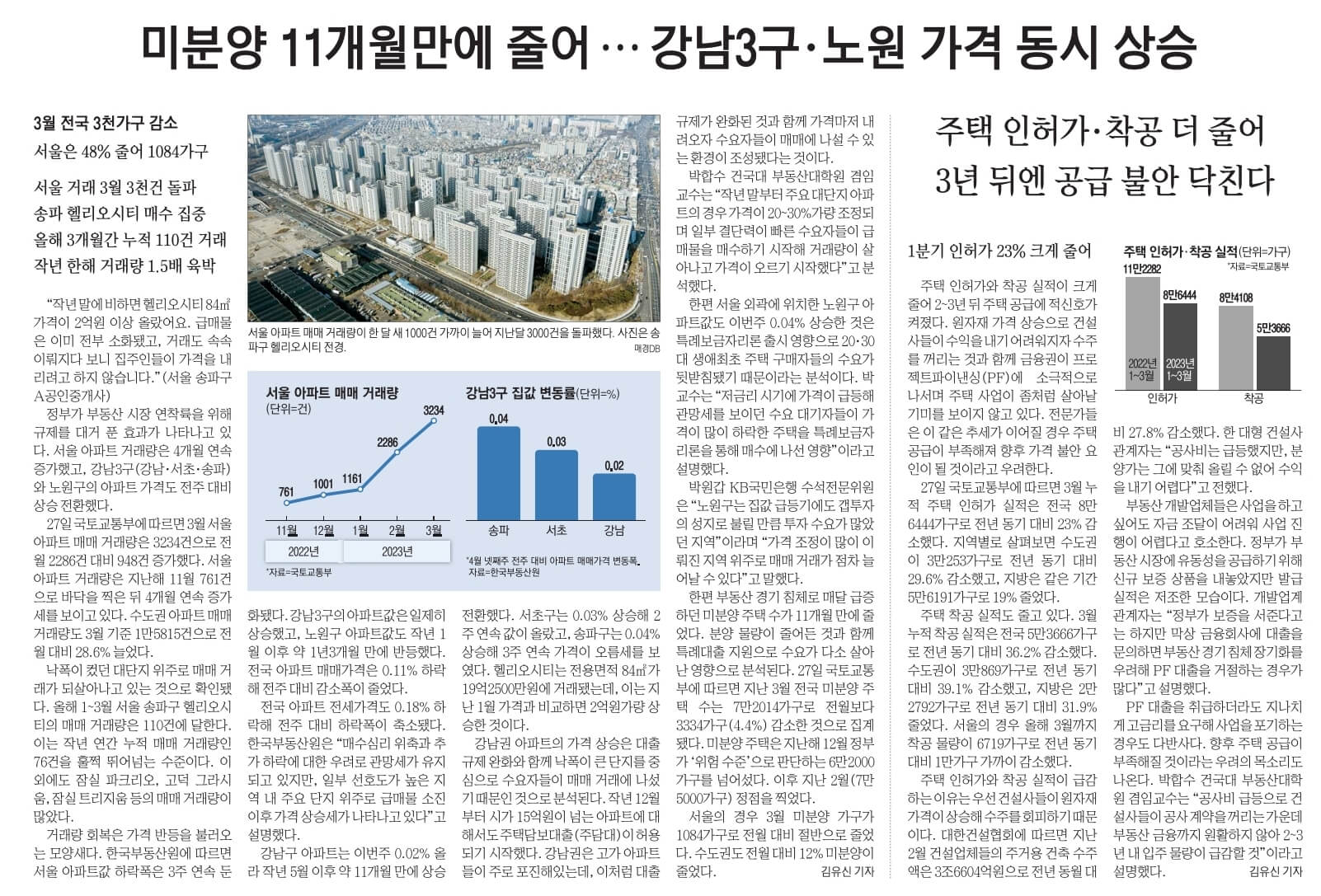 ☞“2~3년 뒤엔 집값 뛴다”...국토부 내놓은 이 숫자에 끔찍한 의미가…주택 1분기 인허가 23% 줄어 서울은 착공물량 1만가구 감소소…원자재값 상승과 PF 경색 영향