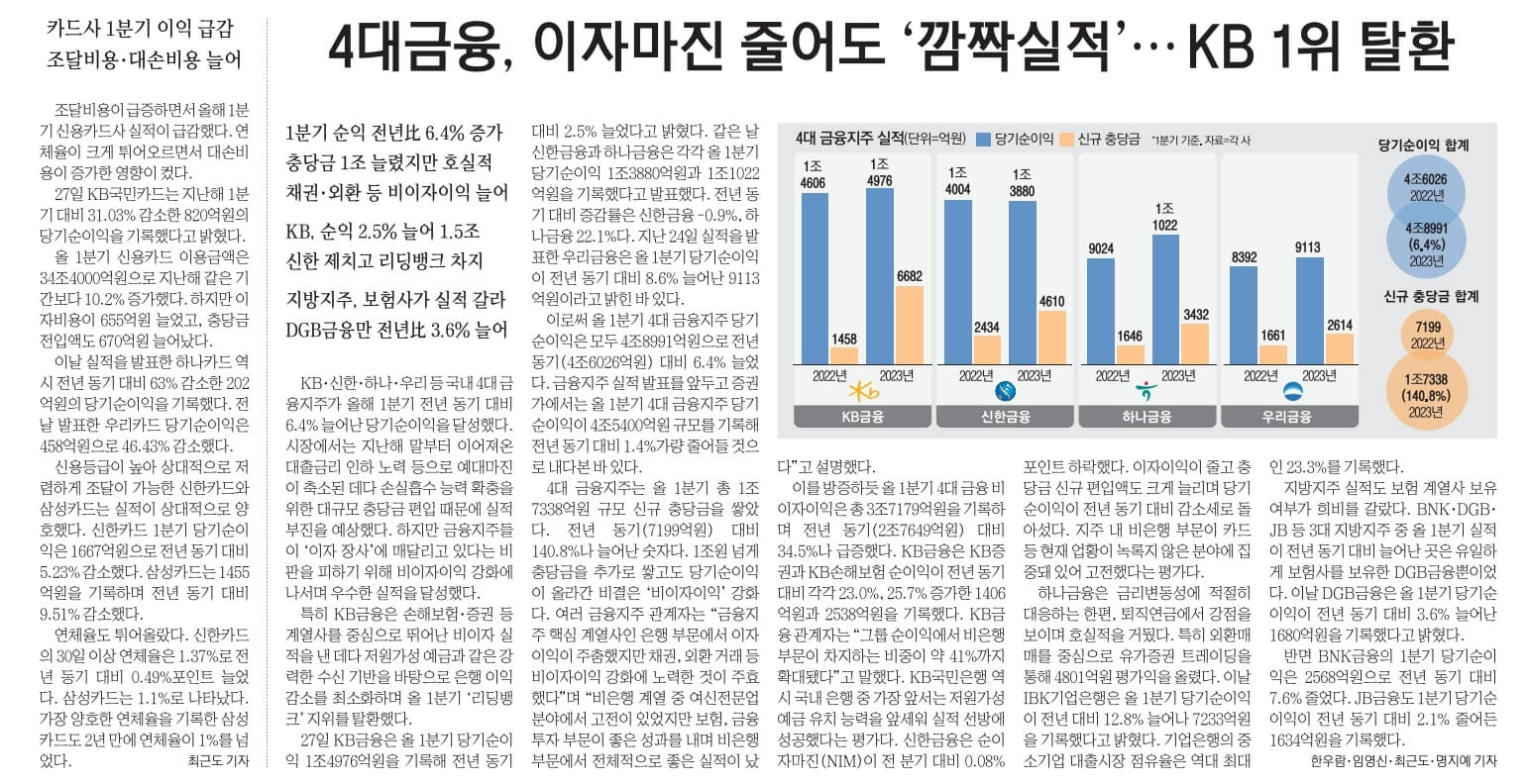 ☞4대금융, 이자마진 줄어도 '깜짝실적'… KB 1위 탈환…KB·신한·하나·우리 등 국내 4대 금융지주가 올해 1분기 전년 동기 대비 6.4% 늘어난 당기순이익을 달성했다.