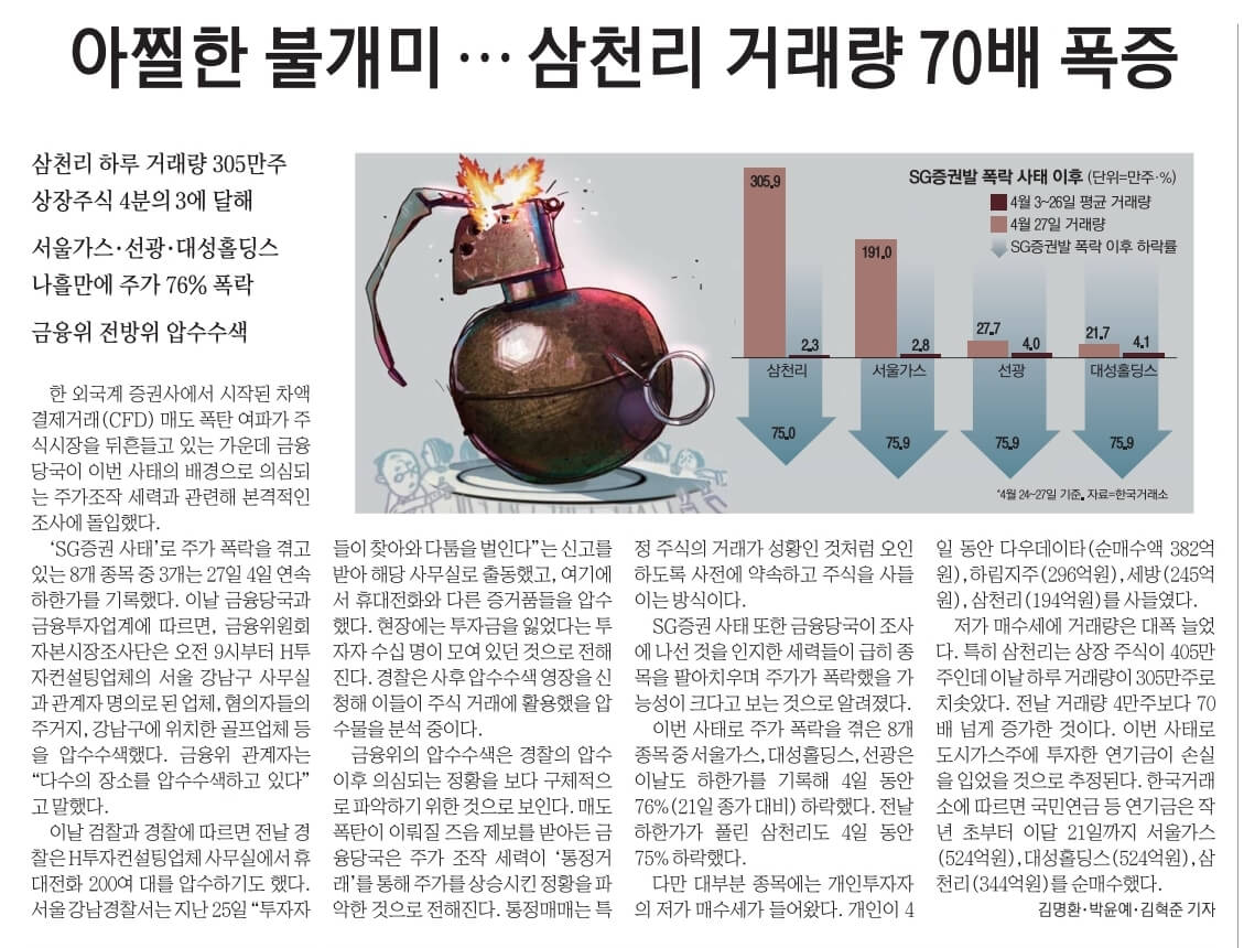 ☞75% 폭락했으니 반등에 베팅?...몰려든 불개미 거래량 70배 폭증…삼천리 하루 거래 305만주…서울가스·선광·대성홀딩스도 나흘만에 주가 76% 폭락