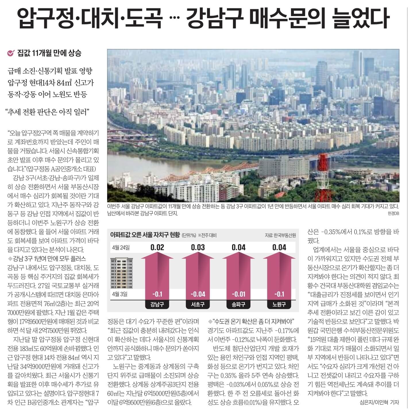 서울 강남구 아파트값이 11개월 만에 상승 전환했다. ‘집값 바로미터’인 강남 3구(강남·서초·송파)뿐 아니라 서울 외곽인 노원구도 1년4개월 만에 상승세에 동참하면서 서울 부동산시장에서 아파트 매수심리 회복 기대