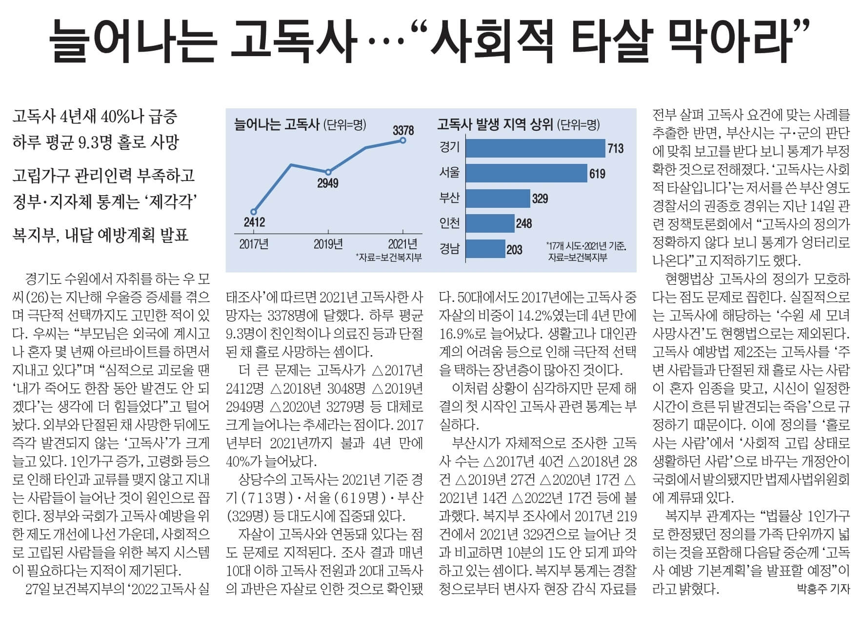 ☞늘어나는 고독사 …"사회적 타살 막아라”…고독사 4년새 40%나 급증 하루 평균 9.3명 홀로 사망…고립가구 관리인력 부족하고 정부·지자체 통계는 '제각각' 복지부, 내달 예방계획 발표
