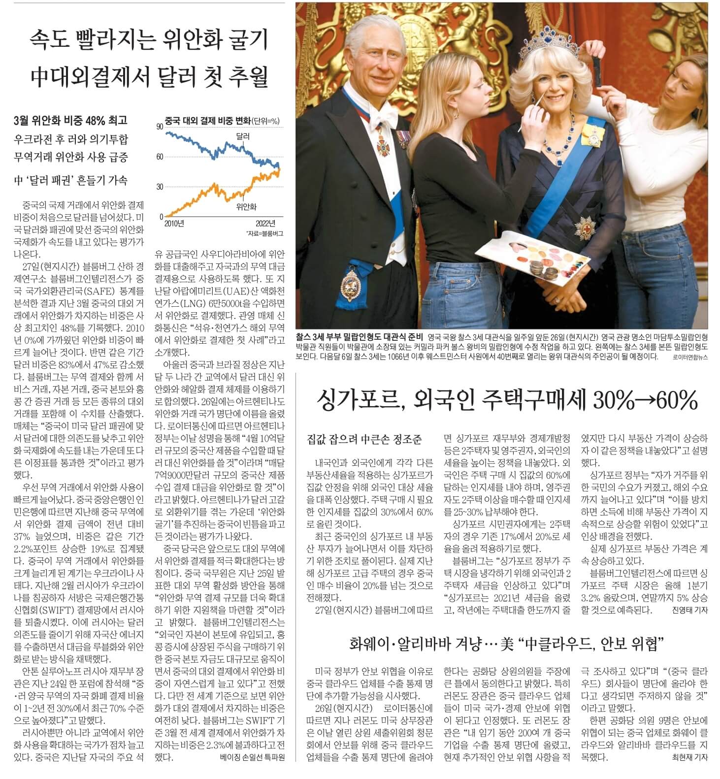 ☞불붙은 위안화 굴기…中대외결제서 달러 첫 추월…3월 위안화 비중 48% 최고…우크라전 후 러와 의기투합 무역거래 위안화 사용 급증… 달러 고갈 외환위기 아르헨도…”중국산 수입땐 위안화 쓸 것" 中 '달러 패권' 흔들기 가속