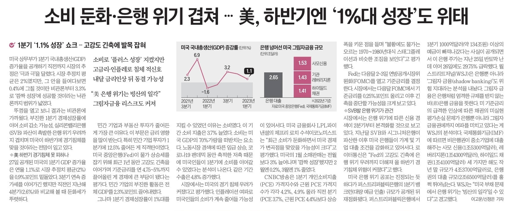 당초 미국 경제가 연착륙할 것이란 전망이 많았으나 GDP 증가율이 예상치를 크게 밑돌며 경착륙 우려가 커지고 있다. 성장률이 둔화하면서 올해 2분기부터 미 경기에 침체가 본격화할 것이라는 전망도 나온다.