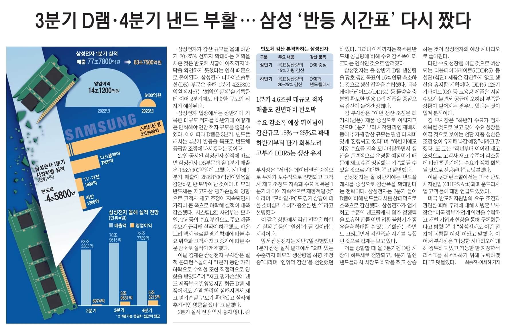 1. 올해 1분기 최악의 실적을 기록한 삼성전자가 실적 반등 시기를 앞당기기 위해 반도체 감산 규모를 기존 생산량의 최대 25%까지 확대할 계획. 27일 반도체 업계와 시장 관계자에 따르면 삼성전자에서 반도체를 담당하는 디바이스솔루션(DS) 부문은 올해 1분기 시작한 감산의 규모를 하반기까지 단계적으로 늘리기로 했음. 삼성전자 DS부문은 2분기 들어 당초 목표 생산량의 10~15% 수준에서 감산을 진행 중. 올해 하반기부터는 감산 규모를 20~25% 수준으로 늘려 시장에서 수급 균형을 맞추겠다는 구상임.