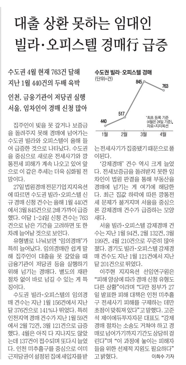 ☞대출 상환 못하는 임대인 빌라·오피스텔 경매行 급증