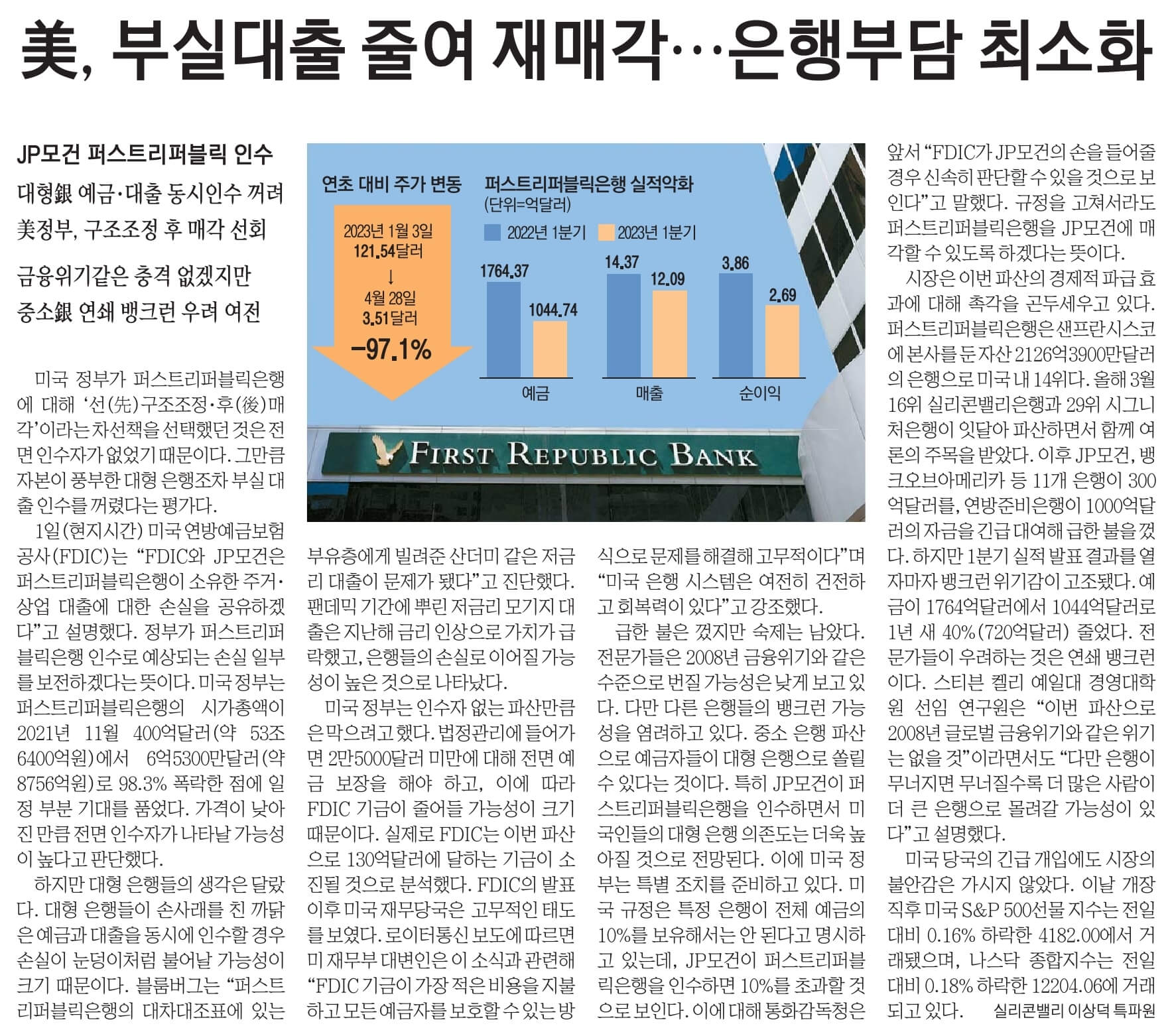 6. 미국 14위 은행인 퍼스트리퍼블릭 은행이 끝내 파산. 미국 정부는 대형 은행들을 상대로 전면 인수를 타진했지만, 대형 은행들을 부실 대출을 함께 인수하는데 손사래를 쳤음. 이에 연방예금공사는 퍼스트리퍼블릭 은행을 먼저 인수해 부실 대출을 줄인 뒤 JP모건에 다시 매각한다는 방침.