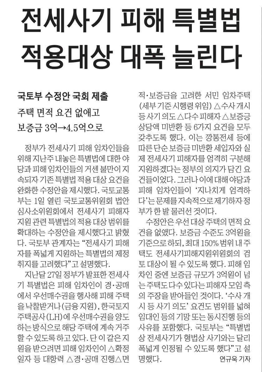 ☞ 보증금 4억5000만원까지…전세사기 피해자 요건 6개→ 4개로 축소