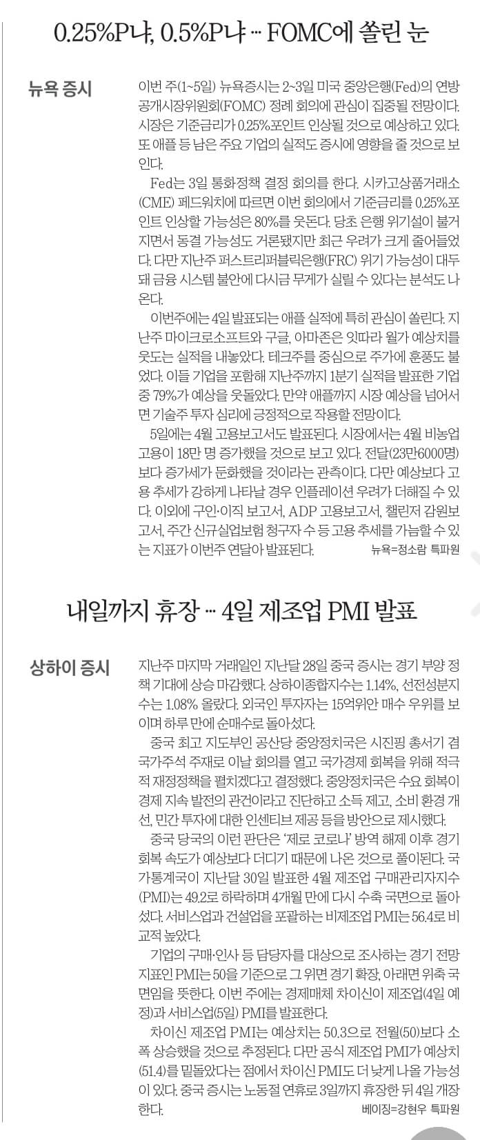 * 뉴욕증시, 5/1(현지시간) 은행권 리스크 완화에도 FOMC 경계감 등에 소폭 하락… 다우 -46.46 (-0.14%) 34,051.70, 나스닥 -13.98(-0.11%) 12,212.60, S&P500 4,167.87(-0.04%), 필라델피아반도체 3,019.09 (+0.81%)