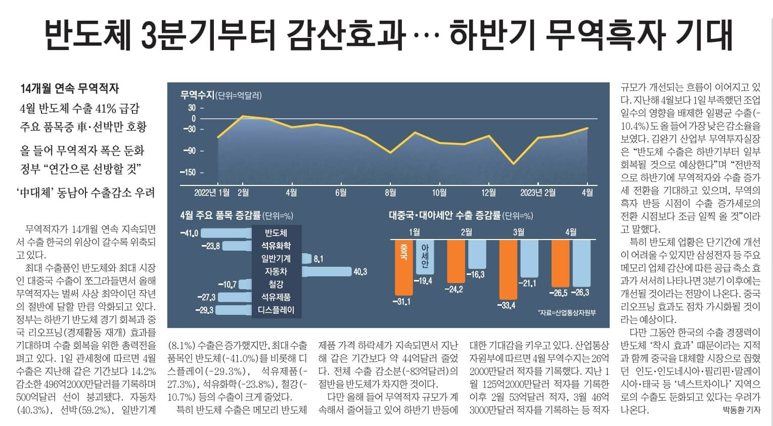 ☞ 반도체 부진에 수출 7개월 연속 감소…14개월째 무역적자...4월 수출, 작년 동기비 14.2% 감소...무역적자는 26억2000만달러 기록