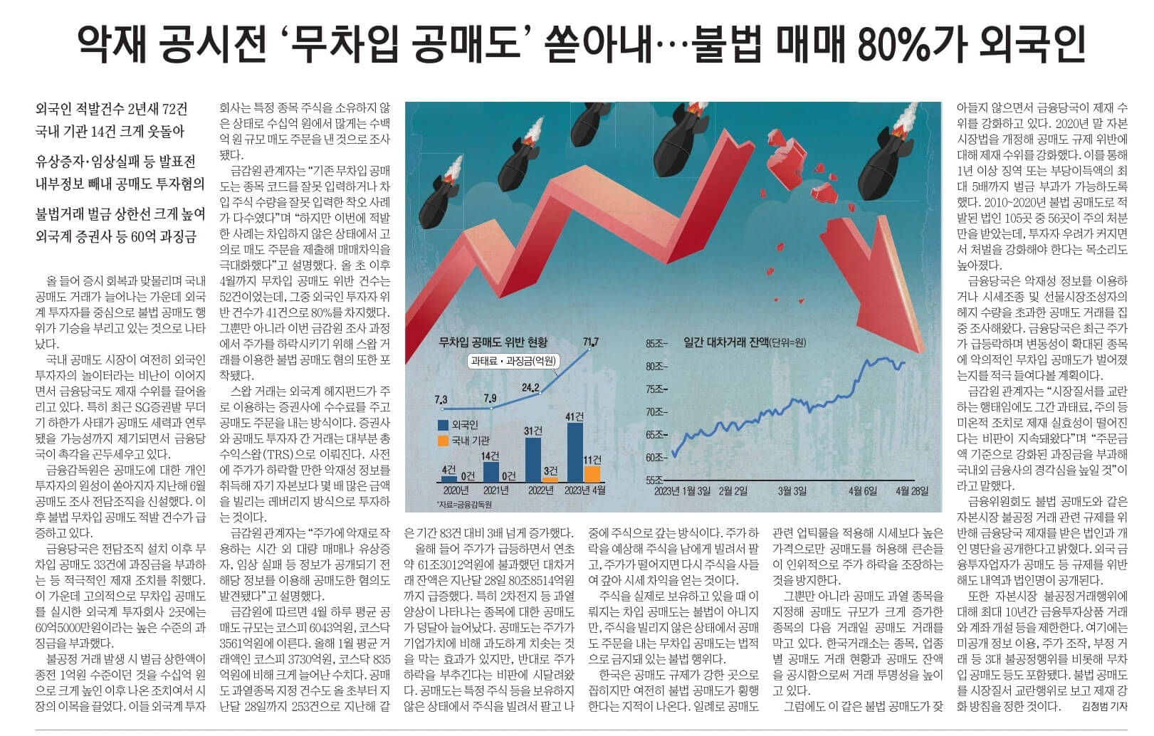 5. 주식을 빌리지 않은 상태(무차입)에서 고의로 매도 주문을 내 주가를 하락시켜 이득을 본 불법 공매도 세력이 금융당국에 첫 적발됨. 1일 금융감독원 공매도조사팀은 올해 들어 4월까지 무차입 공매도 조사 결과 52건의 위반 사례를 적발했다고 밝힘. 그 동안 주문실수나 착오에 의한 무차입 공매도가 적발된 사례는 있지만 이번처럼 악의적인 사례가 포착된 것은 처음. 불법 무차입 공매도 세력이 활개치고 있다는 그동안 시장의 의혹이 사실로 확인된 것.