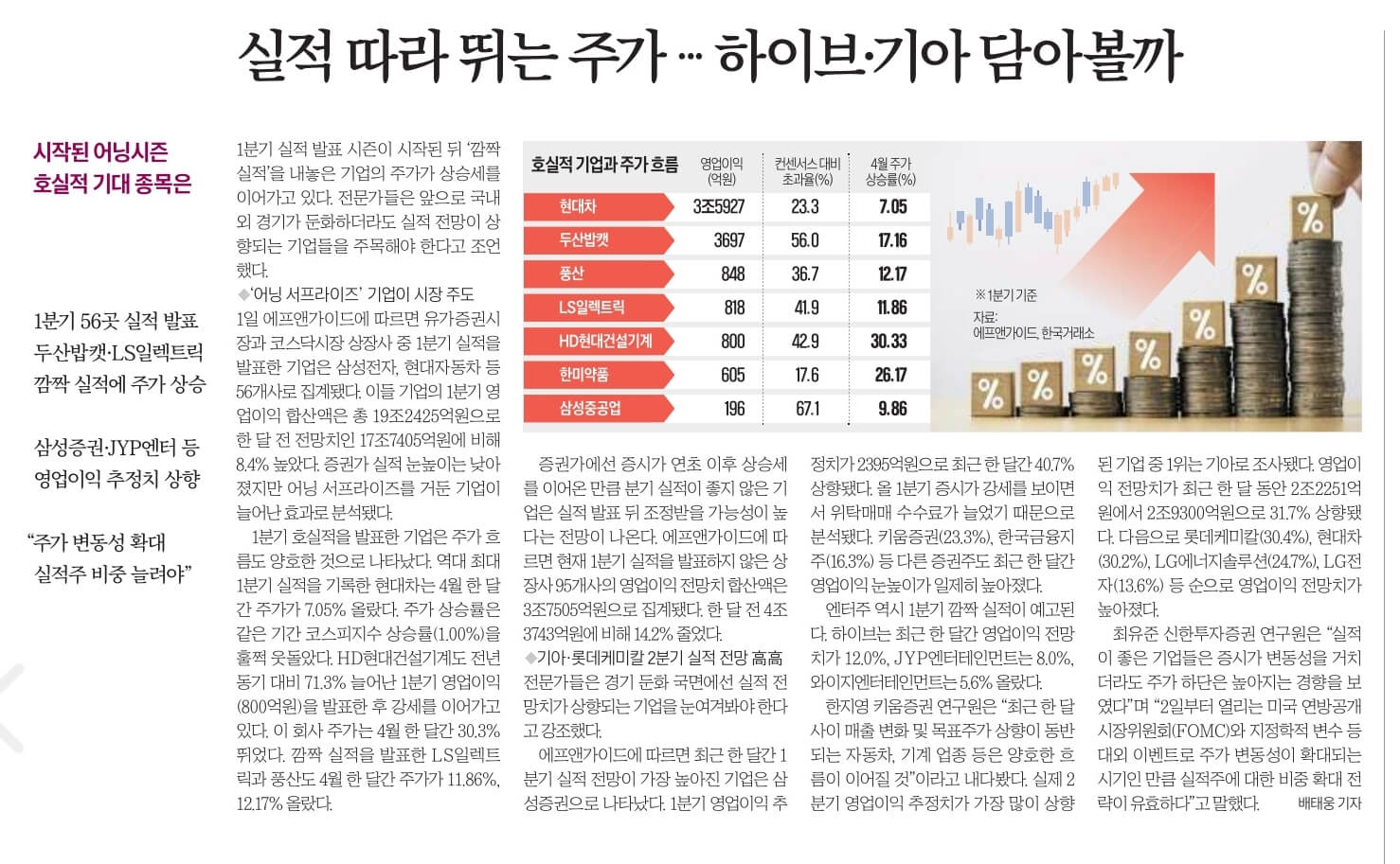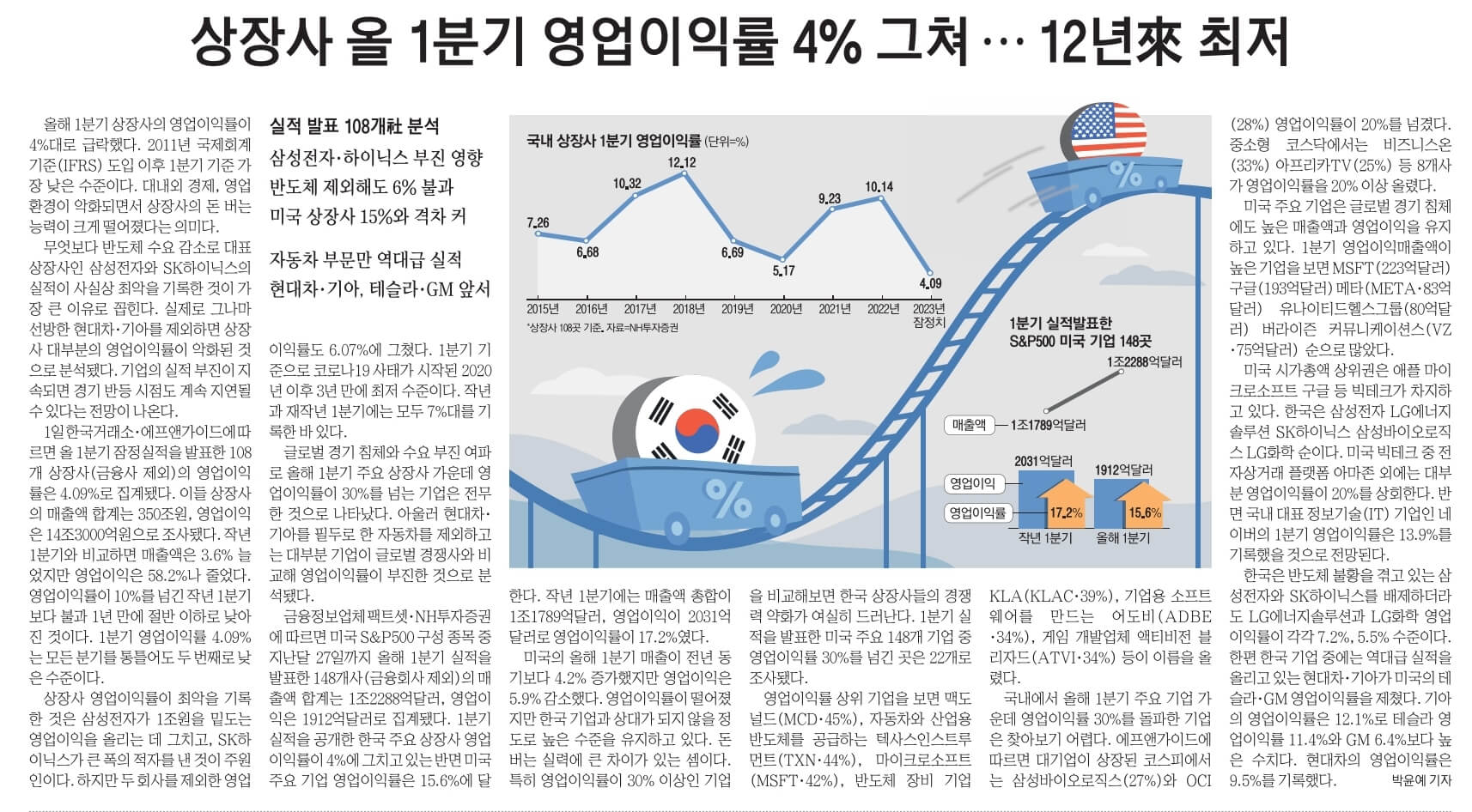2. 올해 1분기 상장사의 영업이익률이 4%대로 급락. 2011년 국제회계기준(IFRS) 도입 이후 1분기 기준으로는 가장 낮은 수준. 대내외 경제, 영업환경이 악화되면서 상장사들의 돈 버는 능력이 크게 떨어졌다는 것을 의미. 무엇보다 반도체 수요 감소로 인해 대표적인 상장사인 삼성전자와 SK하이닉스의 실적이 사실상 최악을 기록한 것이 가장 큰 이유로 꼽힘. 실제로 그나마 선방한 현대차·기아를 제외하면 대부분 상장사들의 영업이익률이 악화된 것으로 분석.