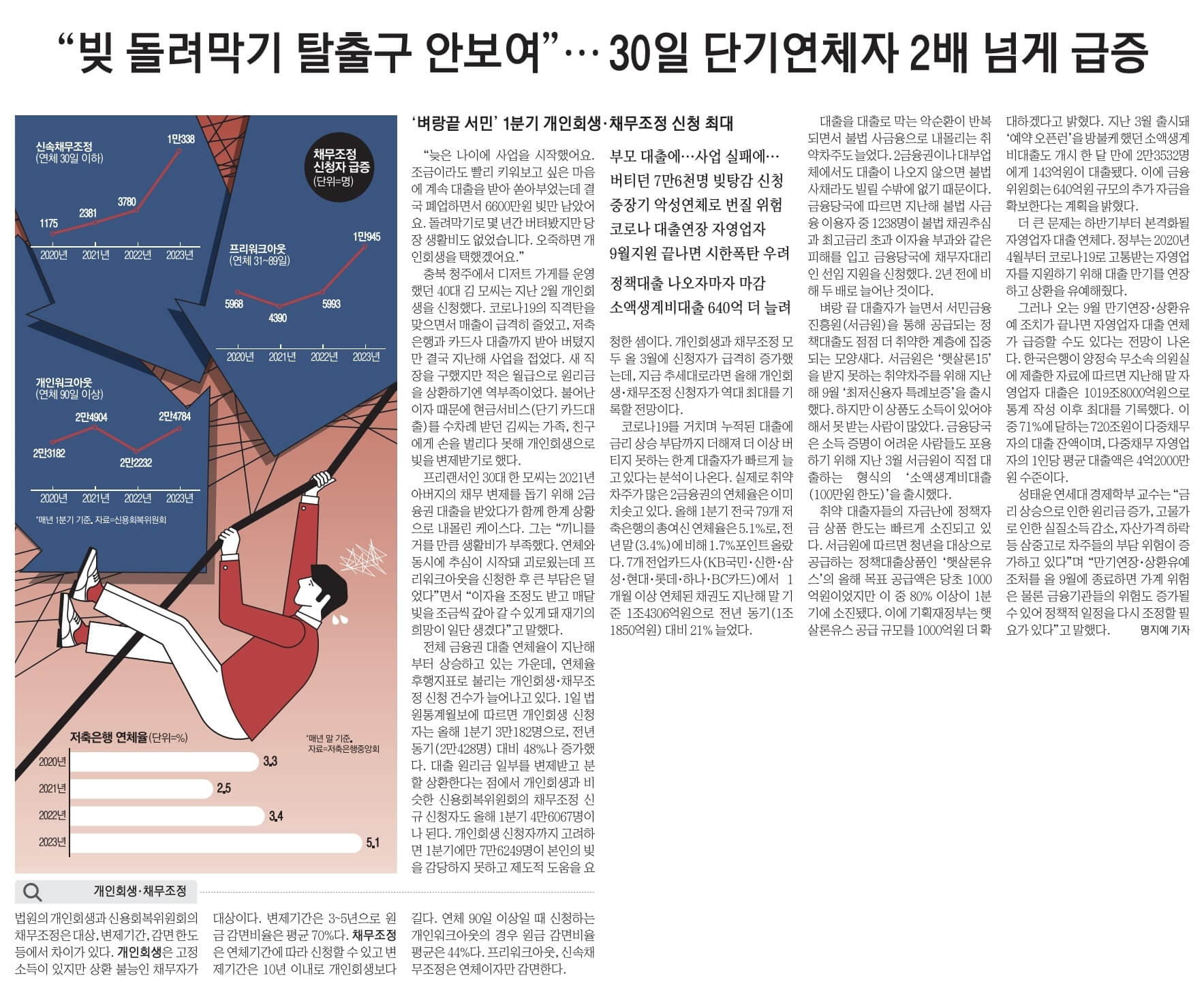 1. 대출을 제때 갚지 못해 채무조정을 신청한 취약대출자가 올해 1분기에만 4만6000명을 넘어섰음. 분기 신청자 기준으로 17년 만에 최대 규모. 지난해 금리상승 여파와 경기침체로 한계 상황에 내몰리는 개인 대출자들이 급증하고 있어 대책 마련이 시급하다는 지적이 나옴. 26일 신용회복위원회에 따르면 올 1분기 채무조정을 신규로 신청한 인원은 4만6067명으로, 지난해 같은 기간(3만2005명)보다 44% 급증. 분기 신청자가 이렇게 많은 것은 신복위 출범 초기인 2005년 이후 처음.