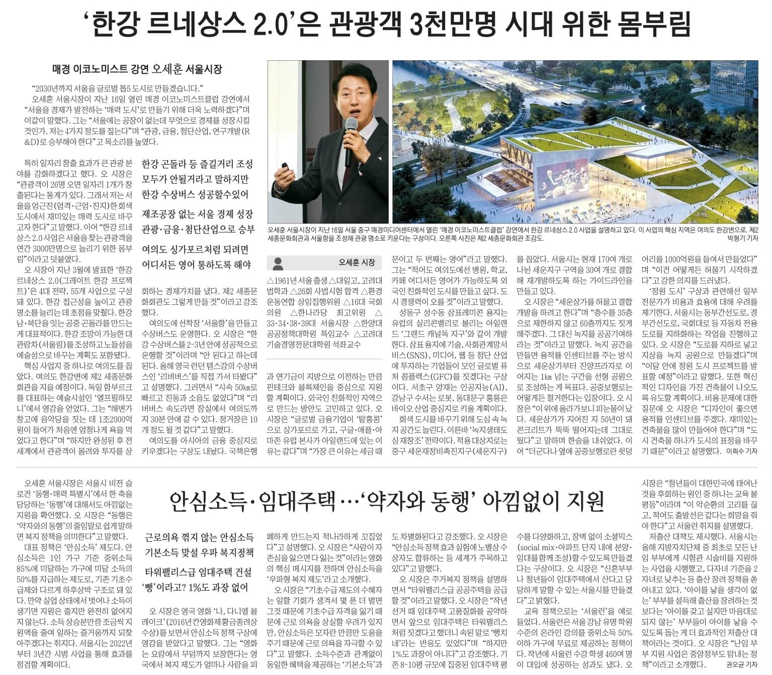 매경 이코노미스트 강연 오세훈 서울시장 "2030년까지 서울을 글로벌 톱5 도시로 만들겠습니다." 오세훈 서울시장이 지난 16일 열린 매경 이코노미스트클럽 강연에서 "서울을 경제가 발전하는 '매력 도시'로 만들기 위해 한강개발 전담기구를 만들것'이라고 밝혔다. 한강르네상스 2.0은 한강 곳곳에 도시를 상징하는 랜드마크와 전망대, 공연장 등을 짓고 시민 접근성도 높여 영국 템스강이나 파리 센강 못지않은 세계적 관광 명소로 만들겠다는 프로젝트다.