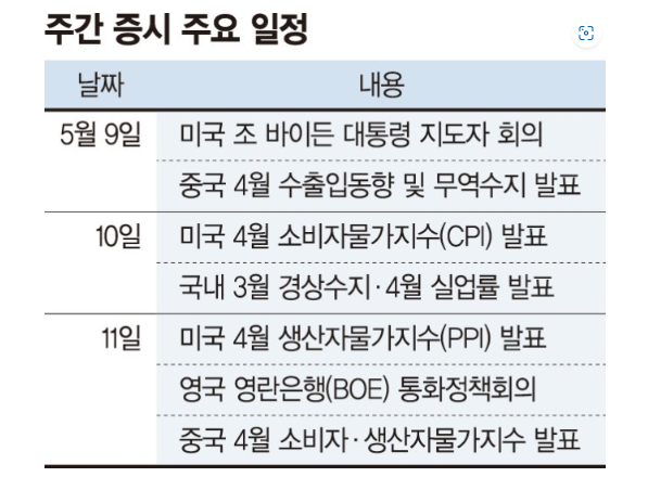- 한고비 넘기고 나니 또 한 고비가 온다. 지난 주 국내 증시는 미국 연방공개시장위원회 (FOMC) 결과와 SG 증권발 주가 폭락사태를 소화하며 약세를 보였다. 이번주에도 미국 부채한도 협상의 불확실성과 은행권 리스크 재부각 우려가 지수에 부담이 될 수 있다는 전망이다. 금주 미국 등 주요국가의 증시 일정에 따라 변화가 예상된다고 합니다