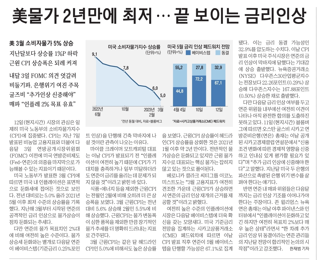 상승률이 5%대로 낮아진 건 18개월 만이다. 3월 실업률(3.5%)도 완전고용 수준이다. 그럼에도 CPI가 5%대로 내려옴에 따라 ‘긴축 종료’에 힘이 실리고 있다.