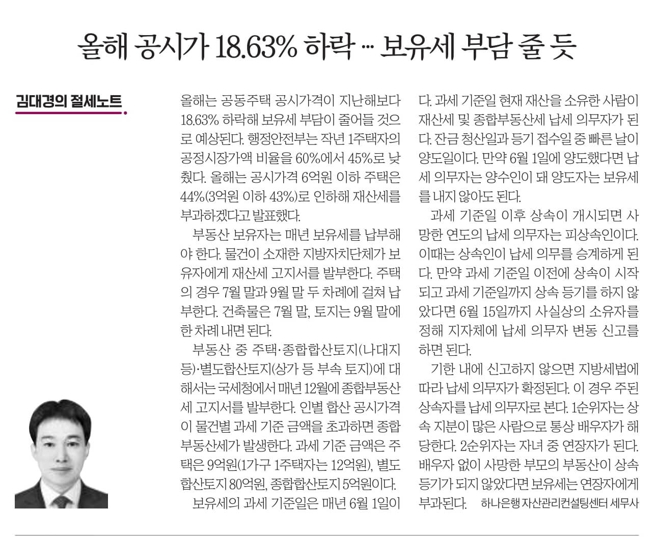 * 올해 공시가 18.63% 하락.....보유세 부담 줄 듯