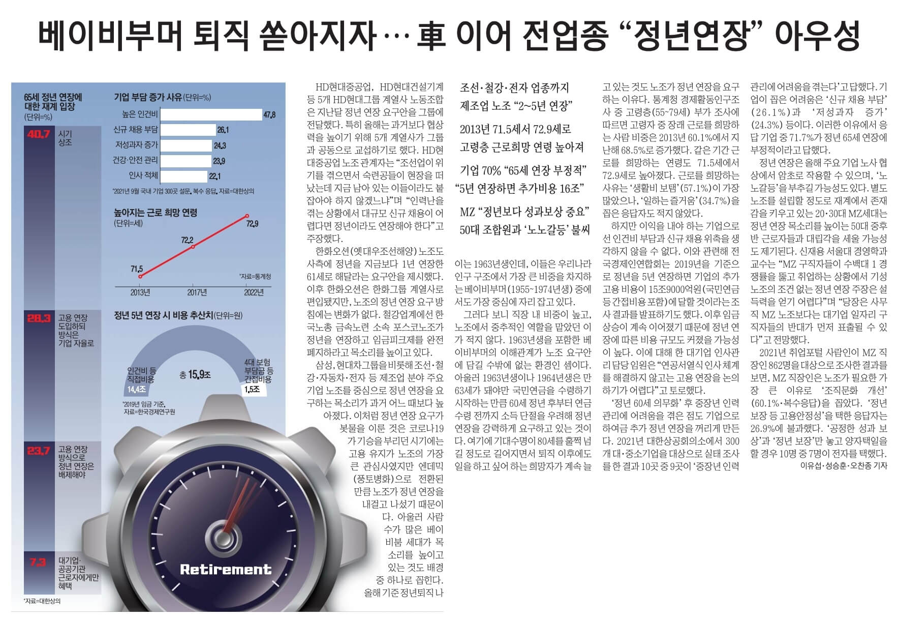 1. 뜨거운 감자, 65세 정년연장 ... 2017년 '정년 60세 의무화' 6년 만에 삼성, 현대차 등 주요 대기업 노조, 65세 정년 요구. 기업들은 필요성엔 공감, 그러나 인건비 부담과 청년 고용 등을 이유로 '의무화'에는 난색.(매경)
