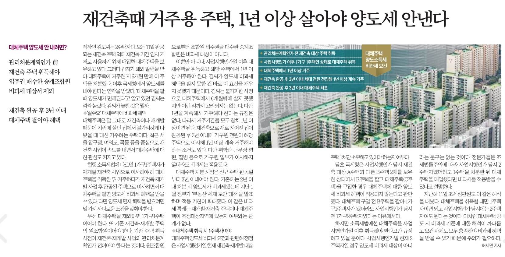 현행 소득세법에 따르면 1가구1주택자가 재개발, 재건축 사업으로 이사해야 해 대체주택을 취득한 뒤 거주하다가 재건축, 재개발 사업 후 완공된 주택으로 이사하면서 대체주택을 팔면 양도세 비과세 혜택을 받을 수 있다. 다만 양도세 면제 혜택을 받으려면 몇 가지 까다로운 조건을 맞춰야 한다.