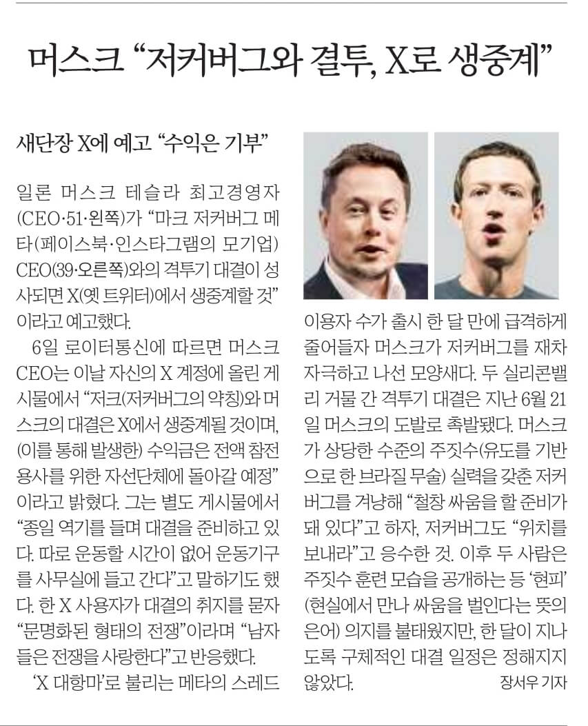 ● 메타의 수장 마크 저커버그 최고경영자와 일론 머스크 테슬라 CEO 간 격투기 대결이 옛 트위터인, '엑스'로 생중계될 전망입니다. 모든 수익은 참전용사를 위한 자선단체에 기부될 거라고 덧붙였습니다. 저커버그가 39세, 머스크가 51세여서 체력적으로는 저커버그가 우세할 수 있다는 전망이 나온다고 합니다.