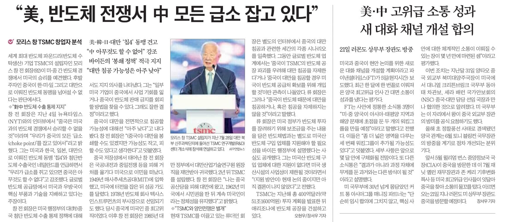 2. 세계 최대 파운드리(반도체 위탁생산) 기업인 대만 TSMC의 창업자 모리스 챙(92) 전 회장이 미국과의 반도체 경쟁에서 중국이 이길 수 없을 것이라고 전망함. 챙 전 회장은 뉴욕타임즈(NYT)와의 인터뷰에서 우리가 급소를 쥐면 중국은 아무것도 할 수 없다며 이 같이 밝힘. 그는 중국이 대만을 침공할 가능성에 대해서는 매우 낮다고 전망.