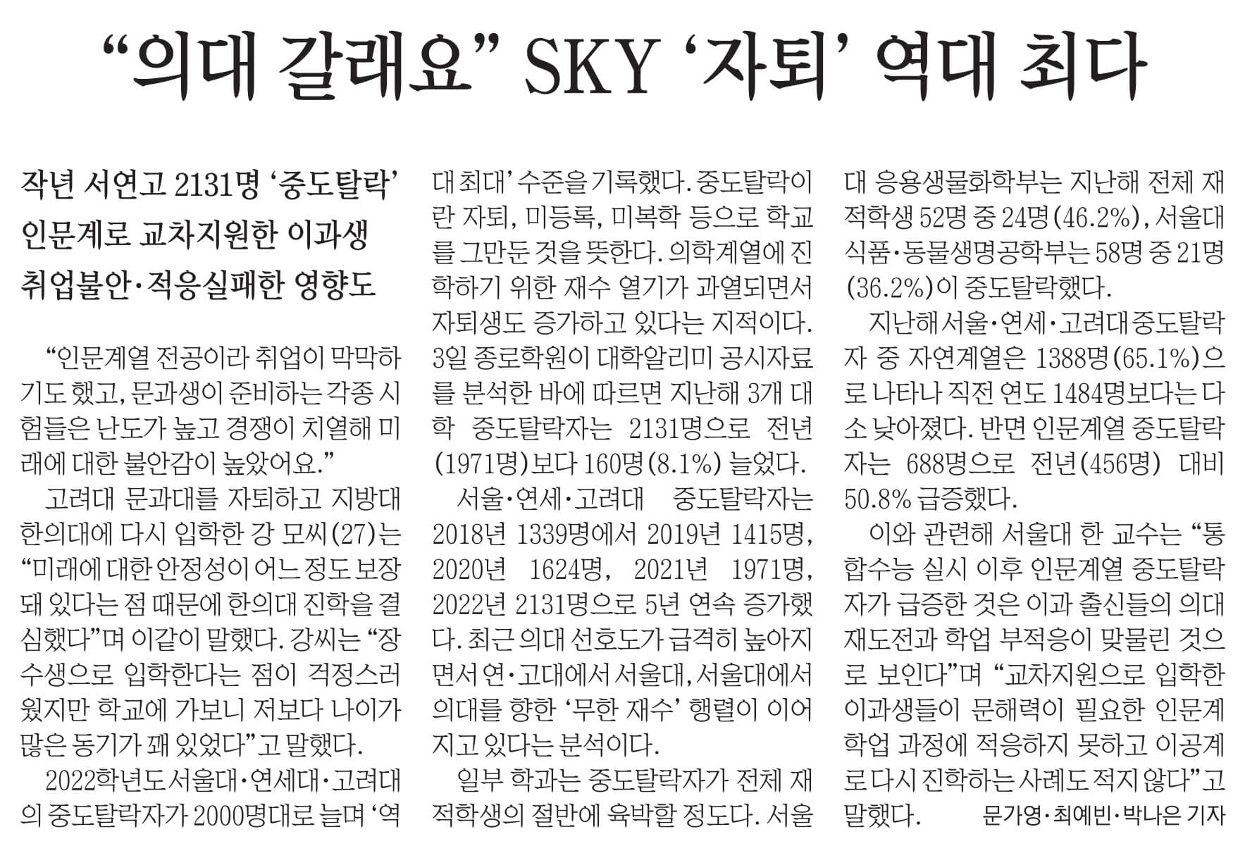 26. SKY 중도탈락 작년 2천131명 '5년새 최다'... "의대 진학 추정