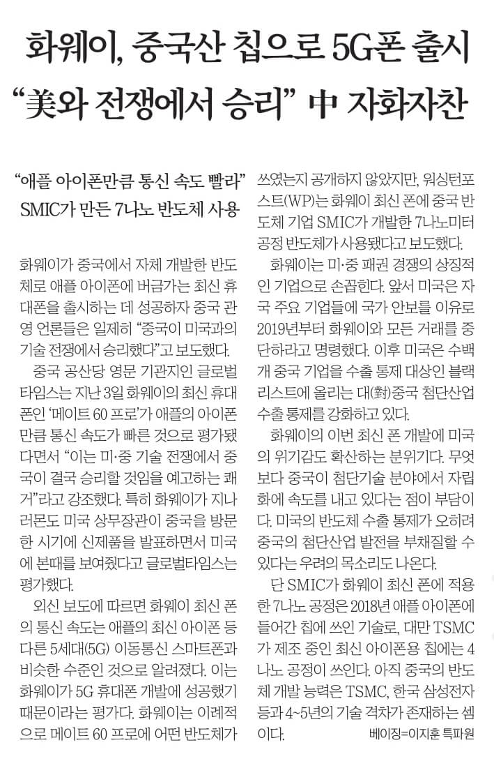 ☞미 기술 봉쇄 뚫고...화웨이 자체 개발 5G폰 1분 만에 매진...스마트폰 메이트60 프로에 자체 5G칩 사용...중국 매체들 미국 포위망 뚫고 기술 전쟁 승리