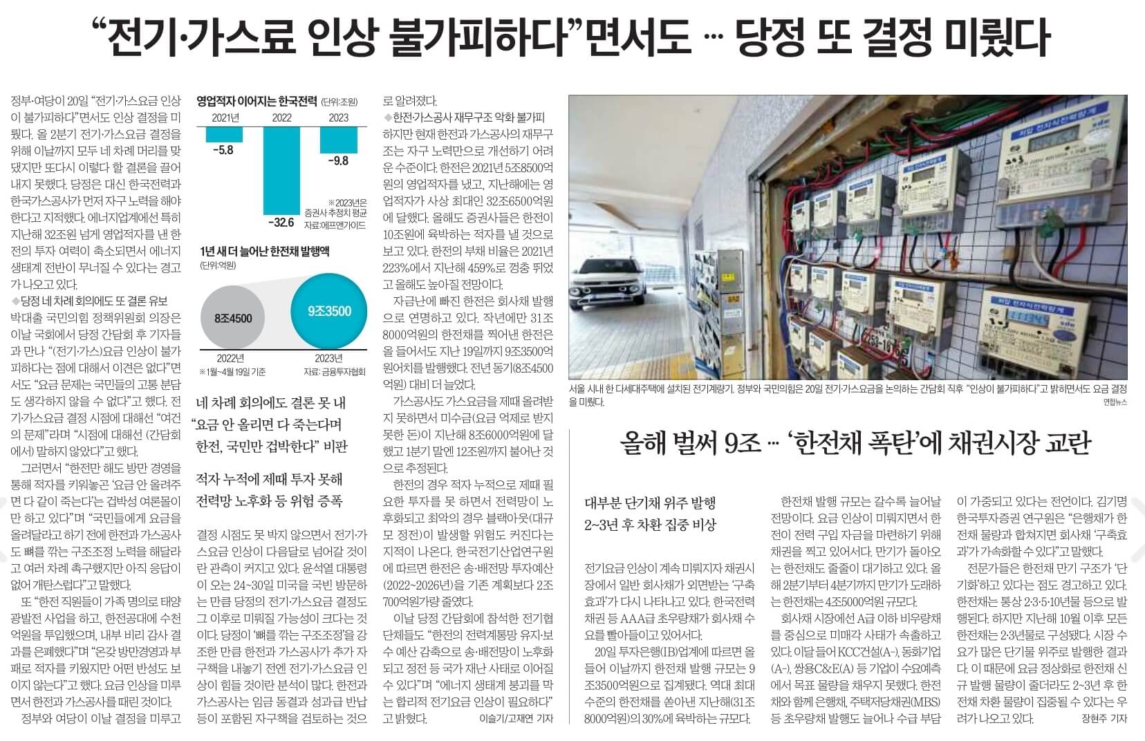 ☞ 또… 올려야 한다는 말뿐, 전기·가스료 결론 못 냈다...당·정·민, 인상 시기·폭 못 정해...與 “한전이 전기료로 국민 겁박”...산업계 “인상해도 할인제 등 필요”...에너지업계 “독립 에너지기구를”...尹방미 겹쳐 이달 인상 어려울 듯