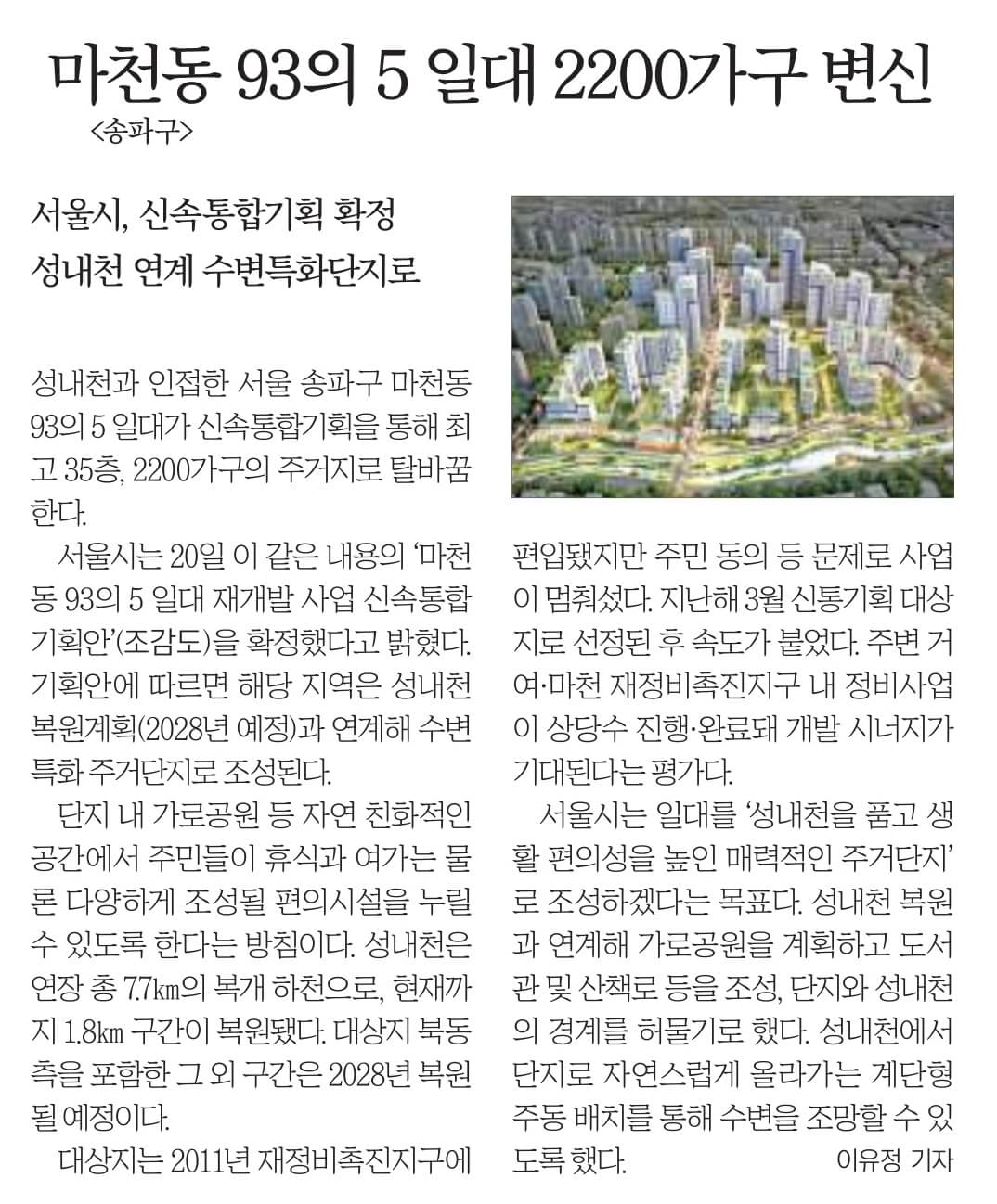 서울 송파구 마천동 93-5 일대 재개발 사업이 본궤도에 올랐다. 성내천 복원계획과 연계된 수변특화 주거단지로 최고 35층, 2200가구가 들어선다. 그동안 신통기획 대상은 여러번 발표하였지만 실제로 공사가 시작된 곳은 없어 그 역시 우려의 목소리가 커지고 있습니다.