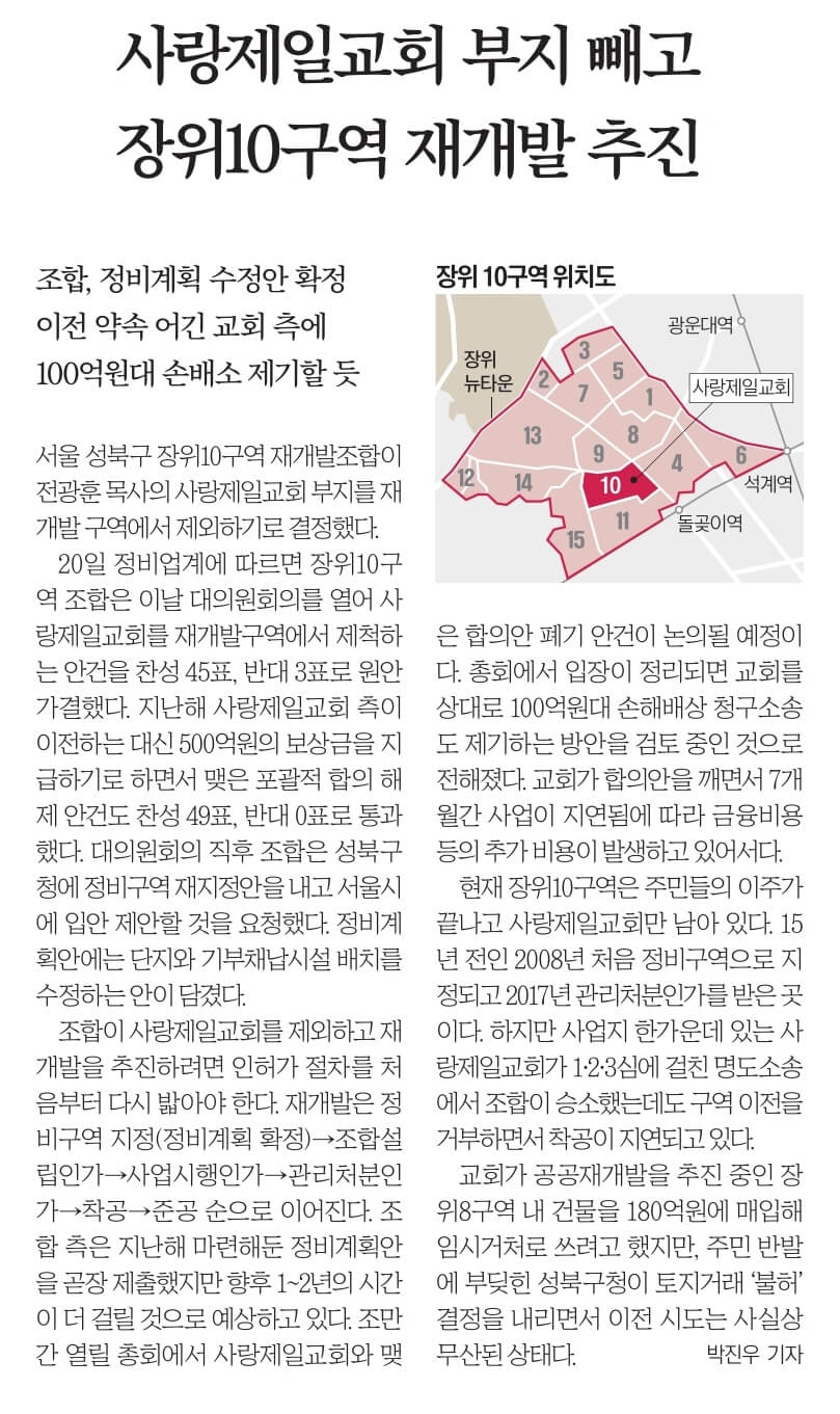 전광훈 목사의 사랑제일교회 알박기로 말이 많던 장위 10구역 재개발 소식입니다. 20일 서울 성북구 장위10구역 재개발 조합 대의원회는 사랑제일교회를 제외하고 재개발을 추진하자는 결정을 내렸습니다. 이와 더불어 그동안약속 어긴 교회 측에 100억원대 손배소 제기할 수 있다고 밝혔습니다 .