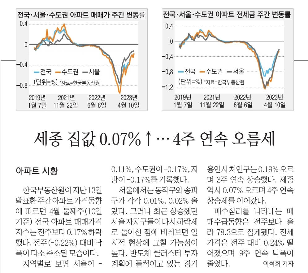 한국부동산원이 발표한 4월 셋째주 주간 아파트가격 동향으로는 강남권을 중심으로 반등세가 두드러 지며 , 인천과 세종에서도 상승세가 보이고 있습니다. 좋은 입지의 주요 단지 위주로 거래가 이루어지고 있습니다