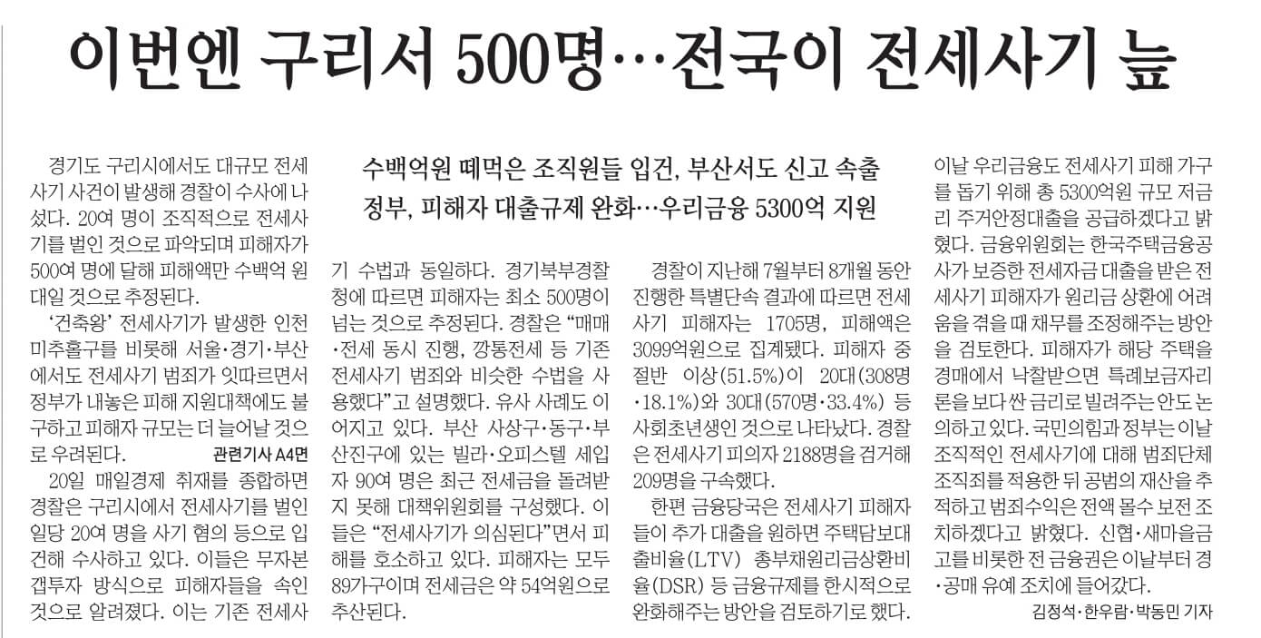 3. 경기 구리시에서도 대규모 전세사기 사건이 발생해 경찰이 수사에 나섬. 20여명이 조직적으로 전세사기를 펼친 것으로 파악되며, 피해자만 500여명에 달해 피해액이 수백억원대일 것으로 추정됨. ‘건축왕’ 전세사기가 발생한 인천 미추홀구를 비롯, 서울·경기·부산에서도 전세사기 범죄가 잇따르면서 정부의 피해 지원 대책에도 불구하고 피해자 규모가 더 늘어날 것으로 우려됨. 20일 매일경제 취재를 종합하면 경찰은 구리시에서 전세사기를 벌인 일당 20여명을 사기 혐의 등으로 입건해 수사하고 있음. 이들은 무자본 갭투자 방식으로 피해자들을 속인 것으로 알려짐.