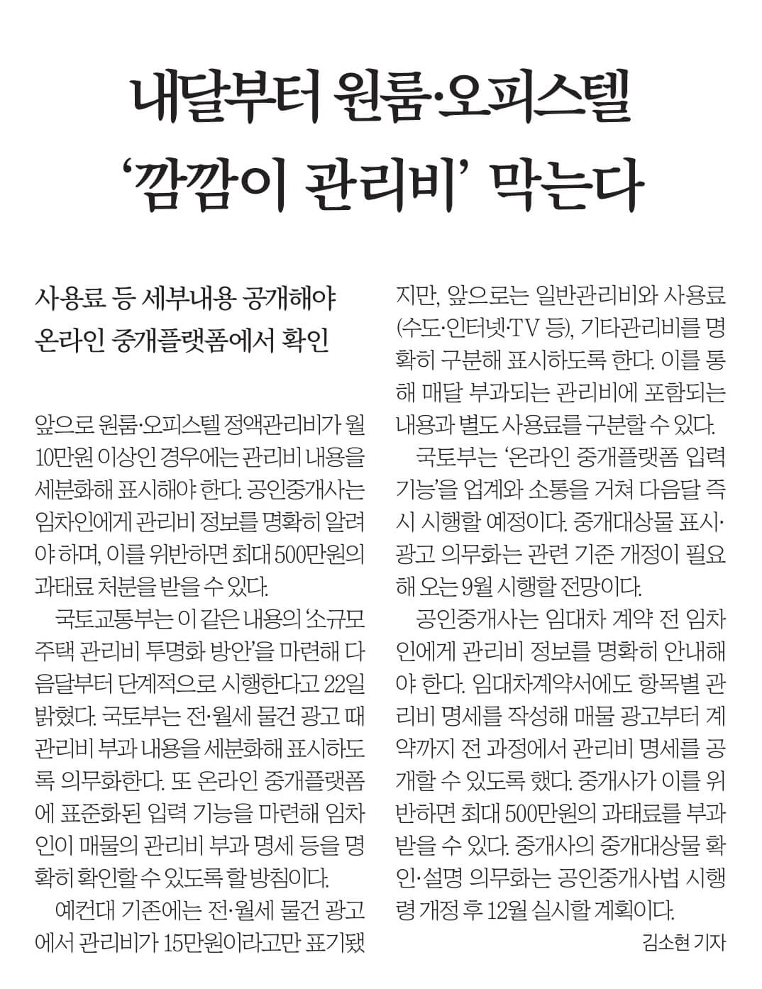 ☞원룸 · 오피스텔 '깜깜이 관리비' 막는다....세부내역 공개 의무화...기존 100세대 이상→50세대 이상으로 의무 대상 확대...전기, 수도, 가스, 인터넷, 청소비 등 관리비 항목 구체화