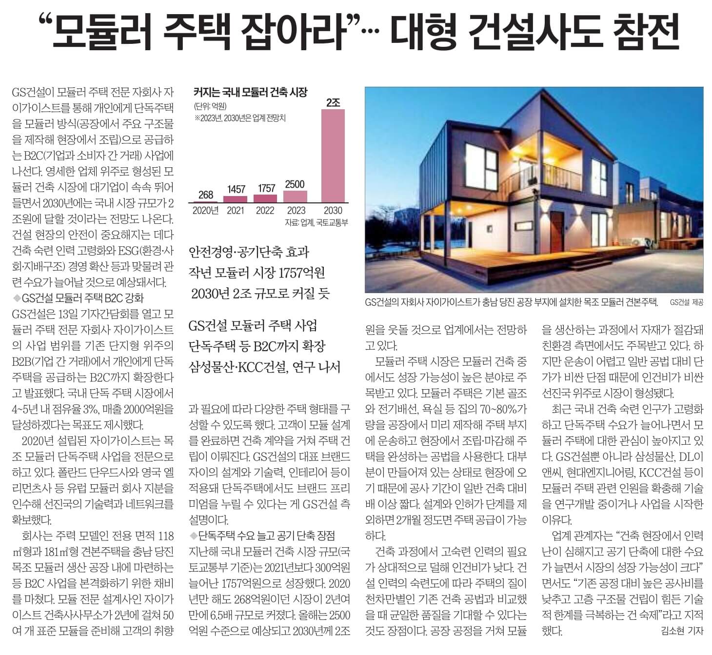 ☞ 단독주택이 2개월 만에 '뚝딱'…'자이' 브랜드 달고 나온다..."모듈러 주택 잡아라"… 대형 건설사도 참전...안전경영·공기단축 효과...작년 모듈러 시장 1757억원, 2030년 2조 규모로 커질 듯...GS건설 모듈러 주택 사업, 단독주택 등 B2C까지 확장...삼성물산·KCC건설, 연구 나서