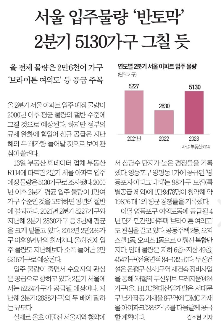 ☞ 서울 입주물량 '반토막'…2분기 5130가구 그칠 듯...올 전체 물량은 2만6천여 가구...'브라이튼 여의도' 등 공급 주목