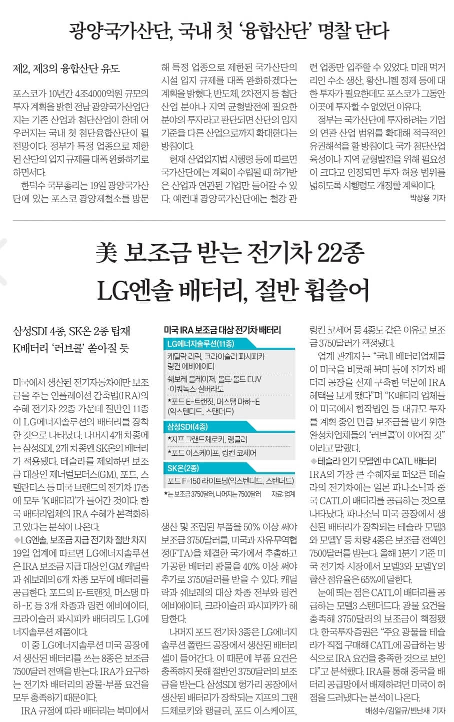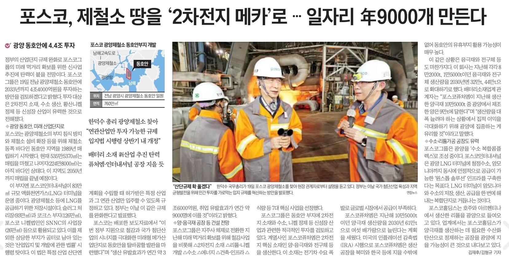 5. 포스코그룹이 전남 광양에 앞으로 10년간 4조4000억원을 투자해 2차전지 소재 등 미래 핵심산업 생산기지를 세울 계획. 전남에서 이뤄진 역대 기업의 투자 가운데 가장 큰 규모임. 정부도 광양의 투자 업종이 철강으로 제한돼 있는데 이같은 규제를 풀어줄 방침.