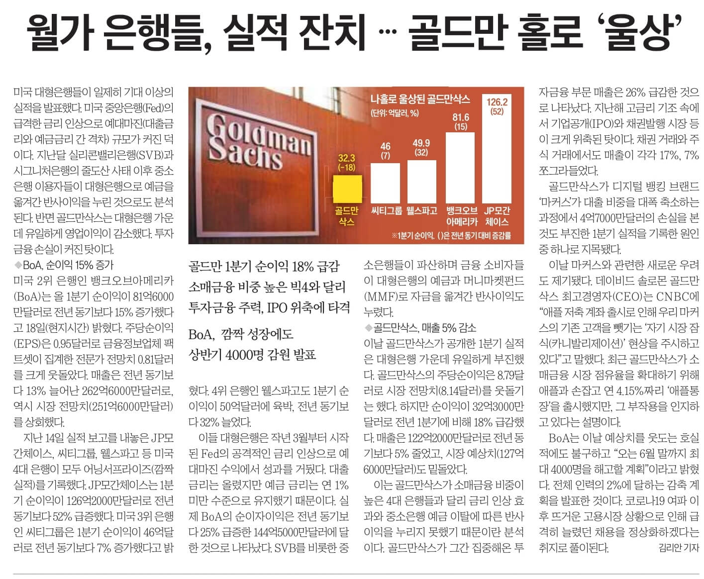 * 월가 은행들, 실적 잔치…골드만 홀로 '울상'