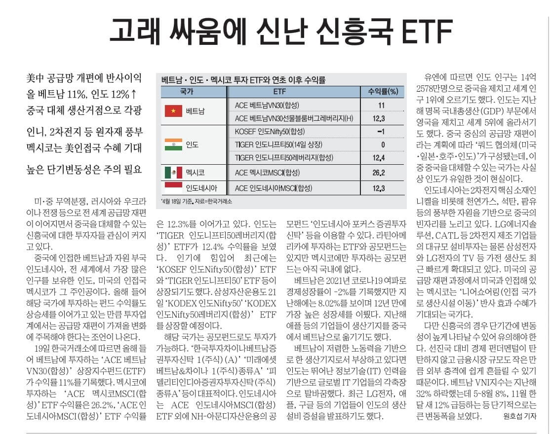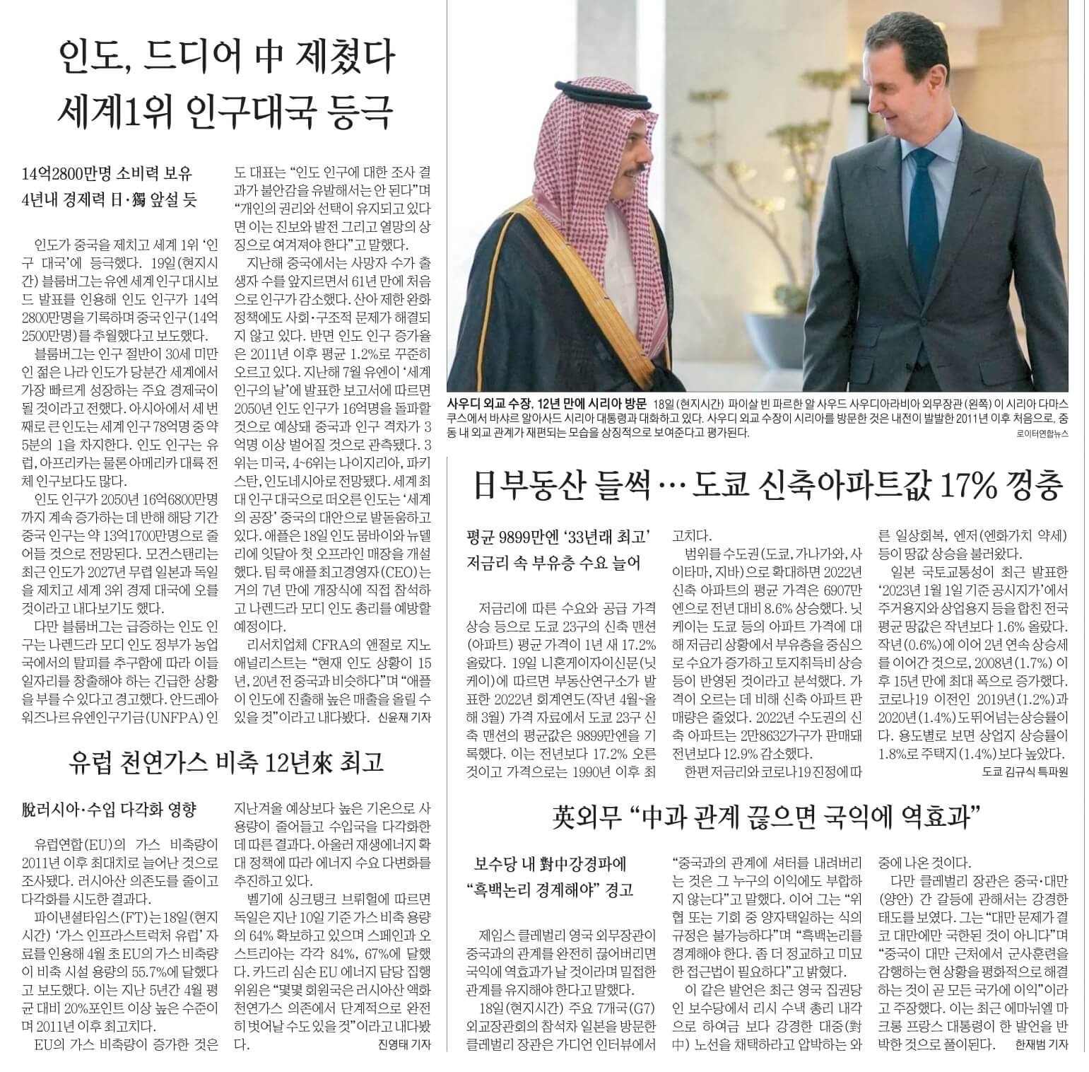 1. 인도가 중국을 제치고 인구 세계 1위에 올랐다, → 블룸버그 통신은, 19일 유엔 세계 인구 대시보드 자료를 인용해 인도가 14억 2800만명을 기록하며 중국(14억 2500만명)를 추월했다고 보도하였다