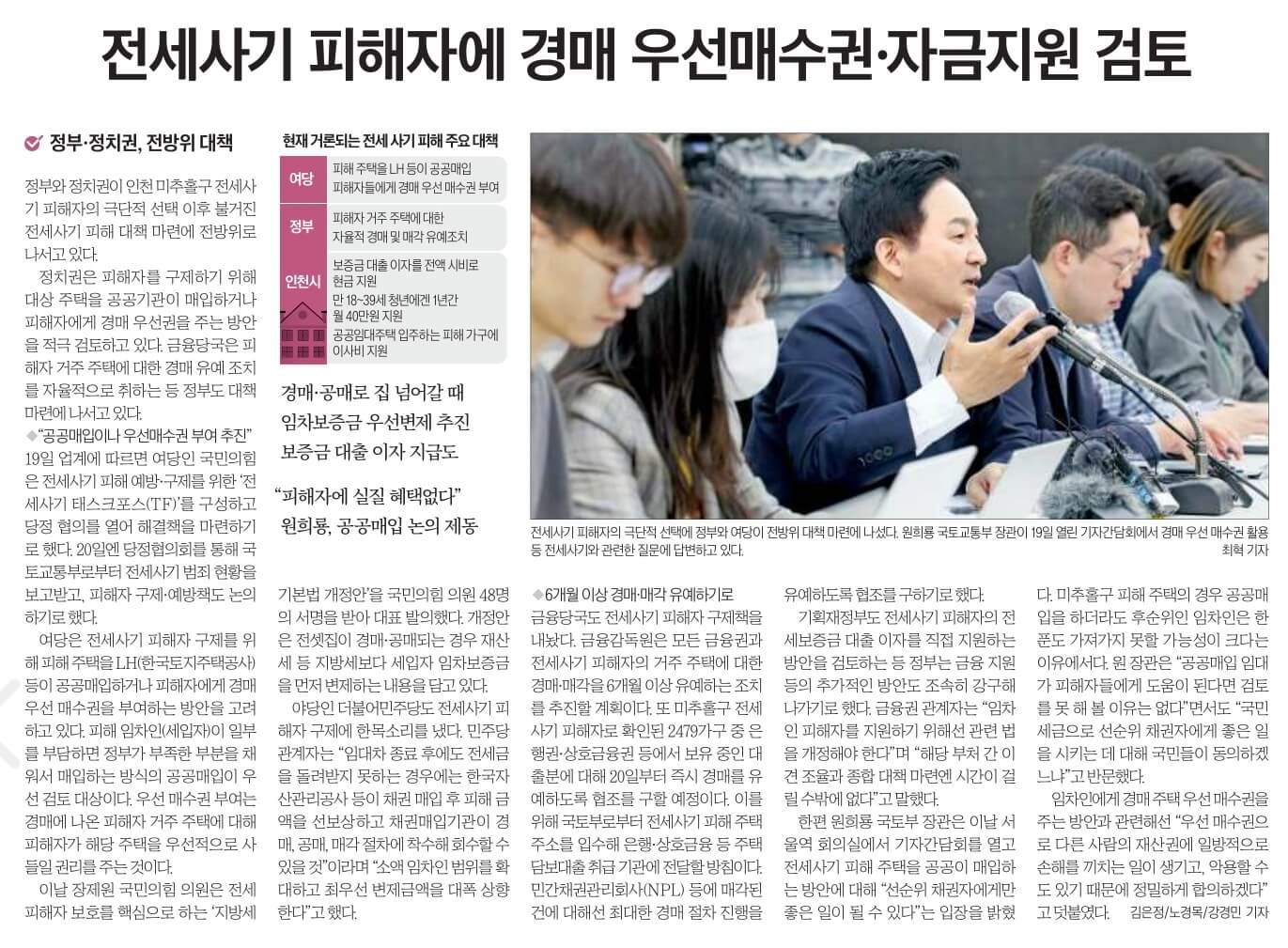 2. 전세가기 피해가 커지는 가운데 국내 모든 금융사들이 전세 사기 피해자 거주 주택에 대해 채권 회수를 위한 경매 등 매각을 당분간 유예 하기로 함.피해자 단체들은 이같은 경매 유예 조치와 별도로 공공매입과 피해구제 등을 골자로 한 깡통전세 특별법 제정을 요구하고 나섰음. 정치권도 추가 조치 필요성을 주장하고 나선 가운데 정부도 추가 대책을 내놓겠다고 밝혔음.