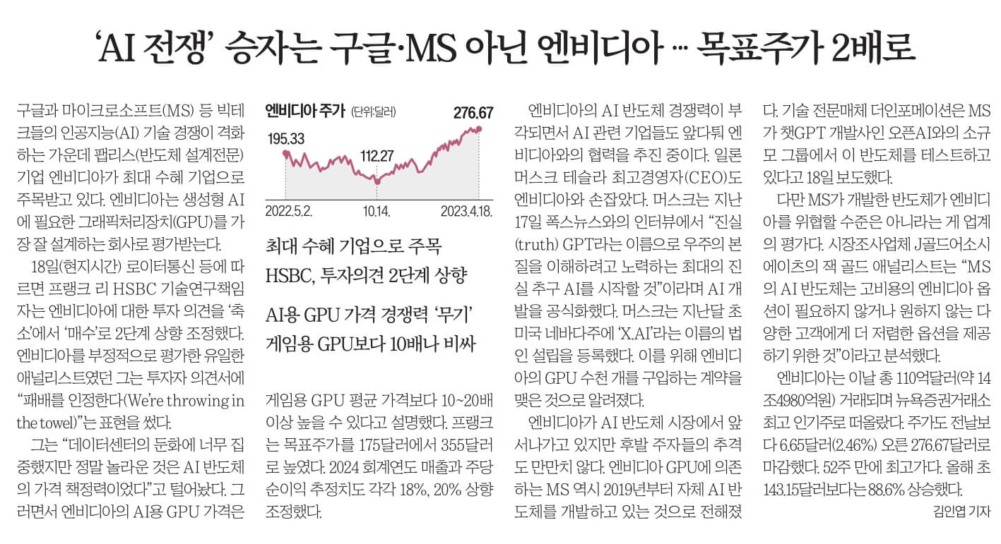 * 'AI 전쟁' 승자는 구글·MS 아닌 엔비디아…목표주가 2배로