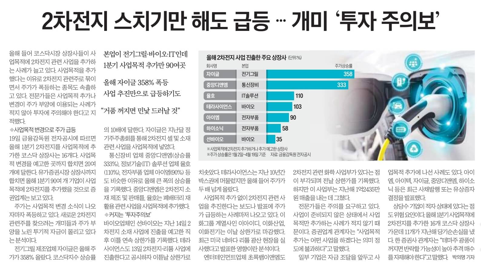 38. 배터리 주가 뛰자…코스닥 상장사들 속속 '2차전지' 사업추가