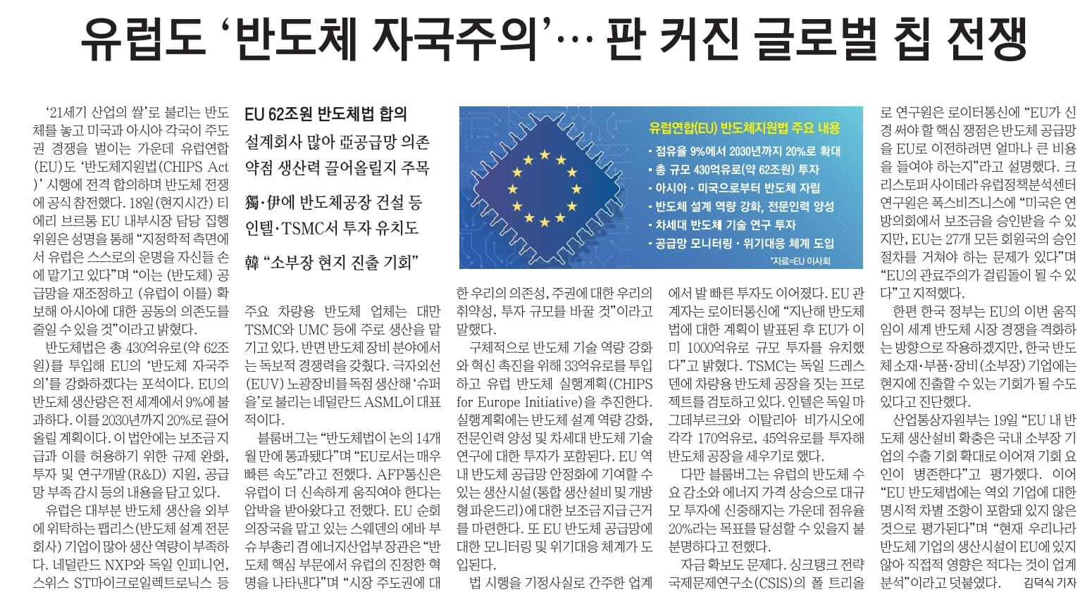3. 유럽연합(EU)이 430억유로(약 62조원)를 투입해 유럽 내에서 반도체 산업을 대대적으로 육성하기로 합의했음. 미국, 아시아에 이어 유럽도 글로벌 반도체 전쟁에 본격적으로 뛰어드는 모양새. 이번 반도체법은 EU의 반도체 역량을 확대해 2030년까지 EU의 시장 점유율을 기존 9%에서 20%로 확대하는 것을 목표로 함.