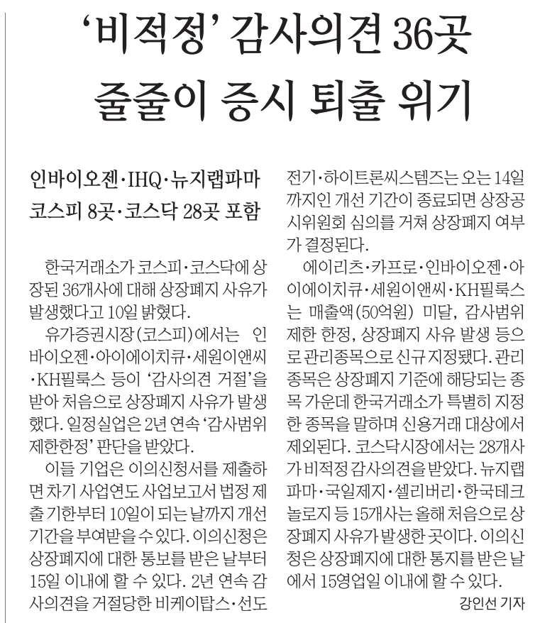 * '비적정' 감사의견 36곳 줄줄이 증시 퇴출 위기