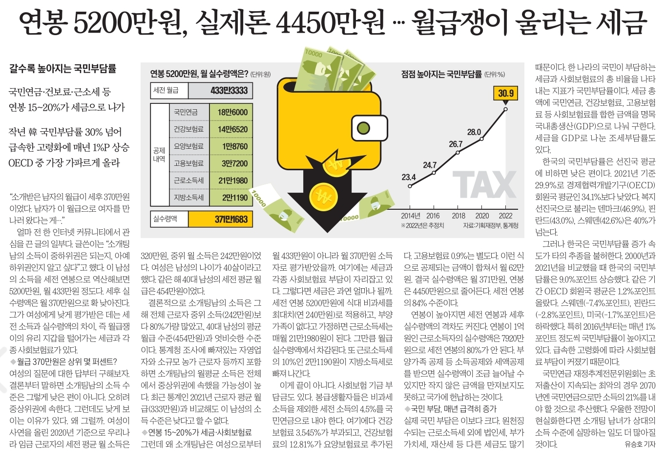 2. ‘국민부담률’ → 국민이 부담하는 세금, 사회보험료 등의 국내총생산(GDP)에 대한 비율로 한국의 국민부담률은 2021년 기준 29.9%로 OECD 회원국 평균인 34.1%보다 낮다. 복지 선진국으로 불리는 덴마크(46.9%), 핀란드(43.0%), 스웨덴(42.6%)은 40%가 넘는다.(한경)▼
