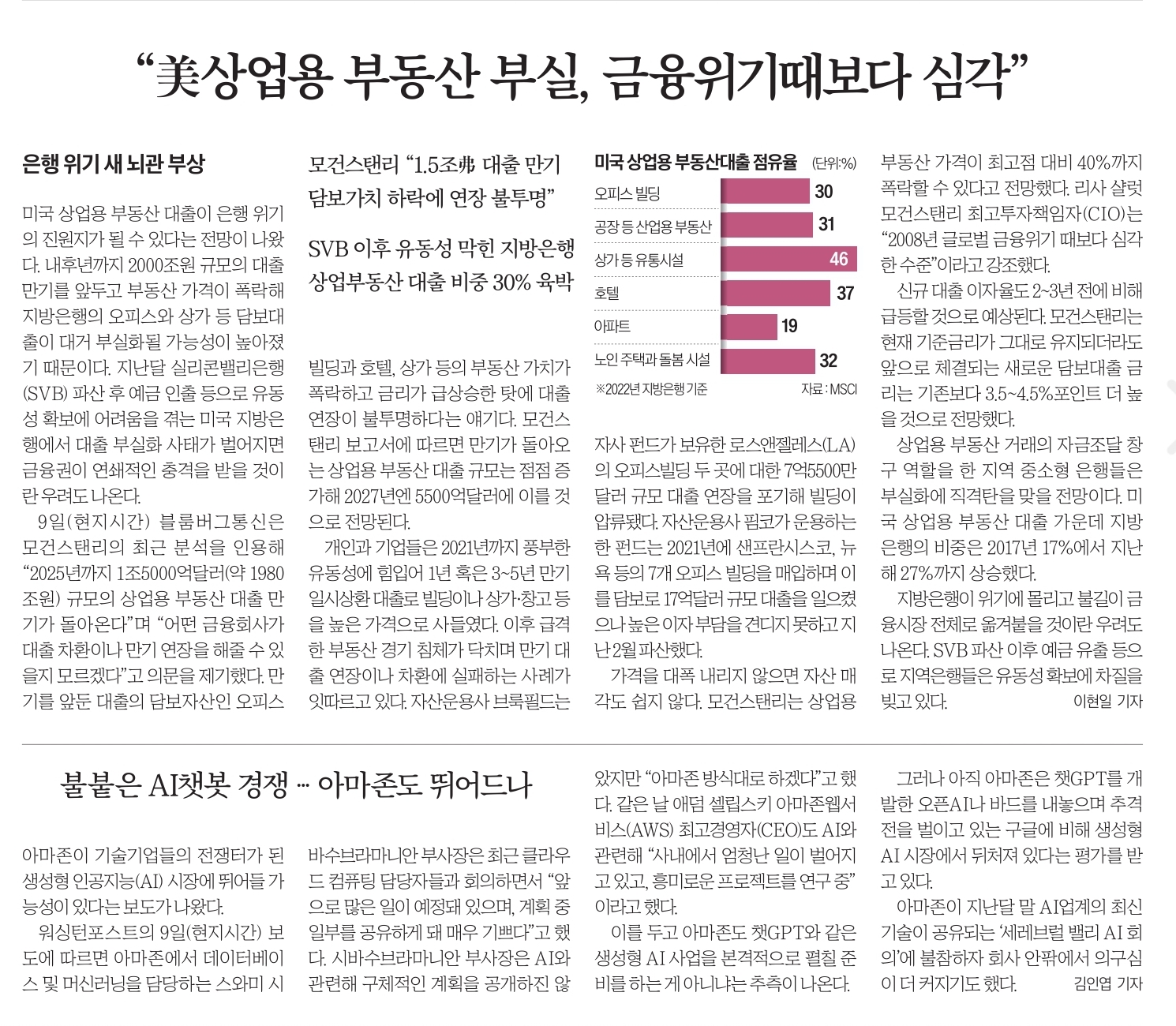 미국 상업용 부동산 대출이 은행 위기의 진원지가 될 수 있다는 전망이 나왔다. 내후년까지 2000조원 규모의 대출 만기를 앞두고 부동산 가격이 폭락해 지방은행의 오피스와 상가 등 담보대출이 대거 부실화될 가능성이 높아졌기 때문이다.
