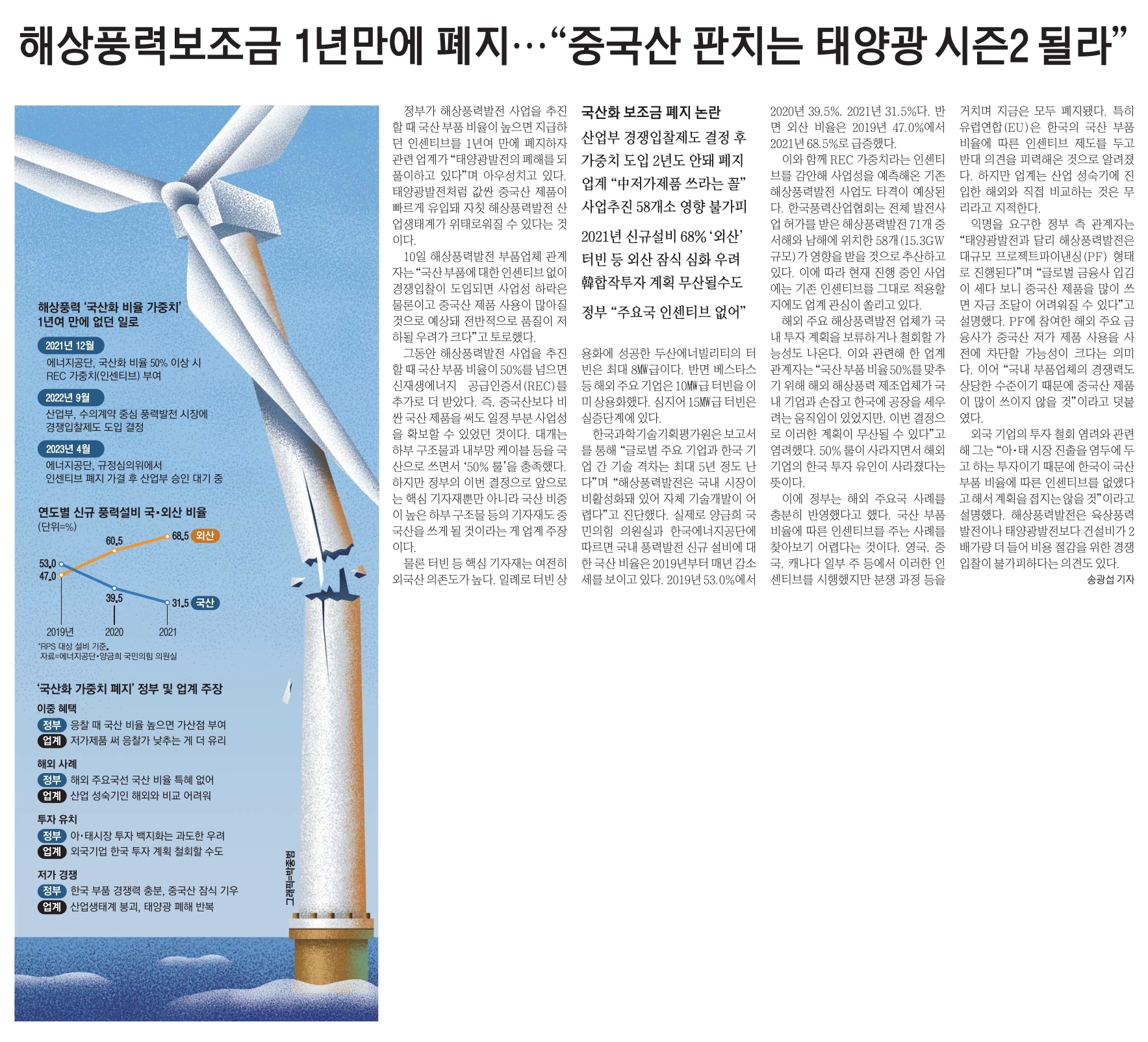 2. 정부가 해상풍력발전 사업 추진 과정에서 국산 부품 비율(LCR)이 50% 이상일 때 신재생에너지 공급인증서(REC) 가중치를 부여하는 방안을 폐지하기로 가결했음. 국산 부품의 비율이 높으면 지급하던 인센티브가 폐지된 것으로 해석됨. 국내 풍력발전 업체들은 입찰 과정에서 사업을 따내려면 결국 값싼 중국산 제품을 많이 쓸 수밖에 없게 된다는 주장을 제기하며 반발하고 있음. 저가 중국산이 시장을 잠식하면 아직 초기 단계인 국내 해상풍력 산업의 생태계가 붕괴될 수 있다는 우려가 나옴.