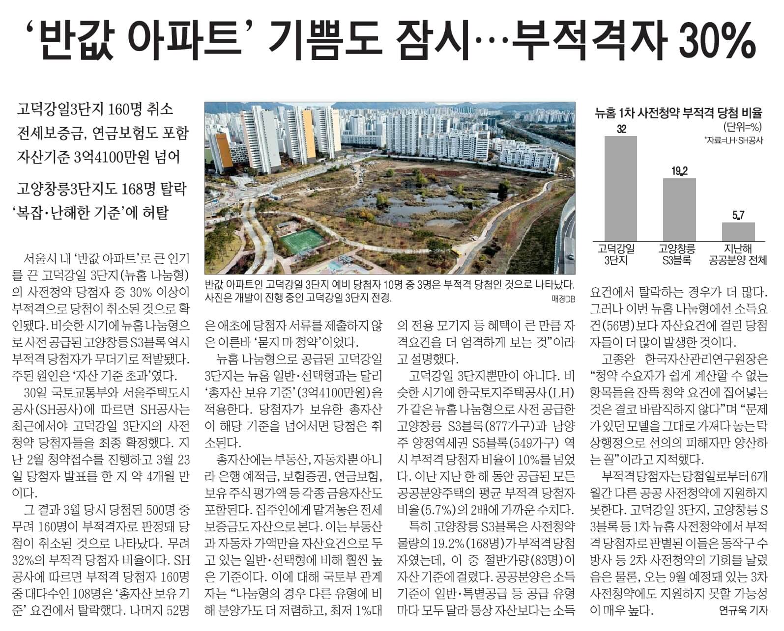 주된 원인은 '자산 기준 초과'였다. 뉴홈 나눔형으로 공급된 고덕강일 3단지는 뉴홈 일반, 선택형과는 달리 '총자산 보유 기준'(3억4100만원)을 적용한다. 당첨자가 보유한 총자산이 해당 기준을 넘어서면 당첨은 취소된다.