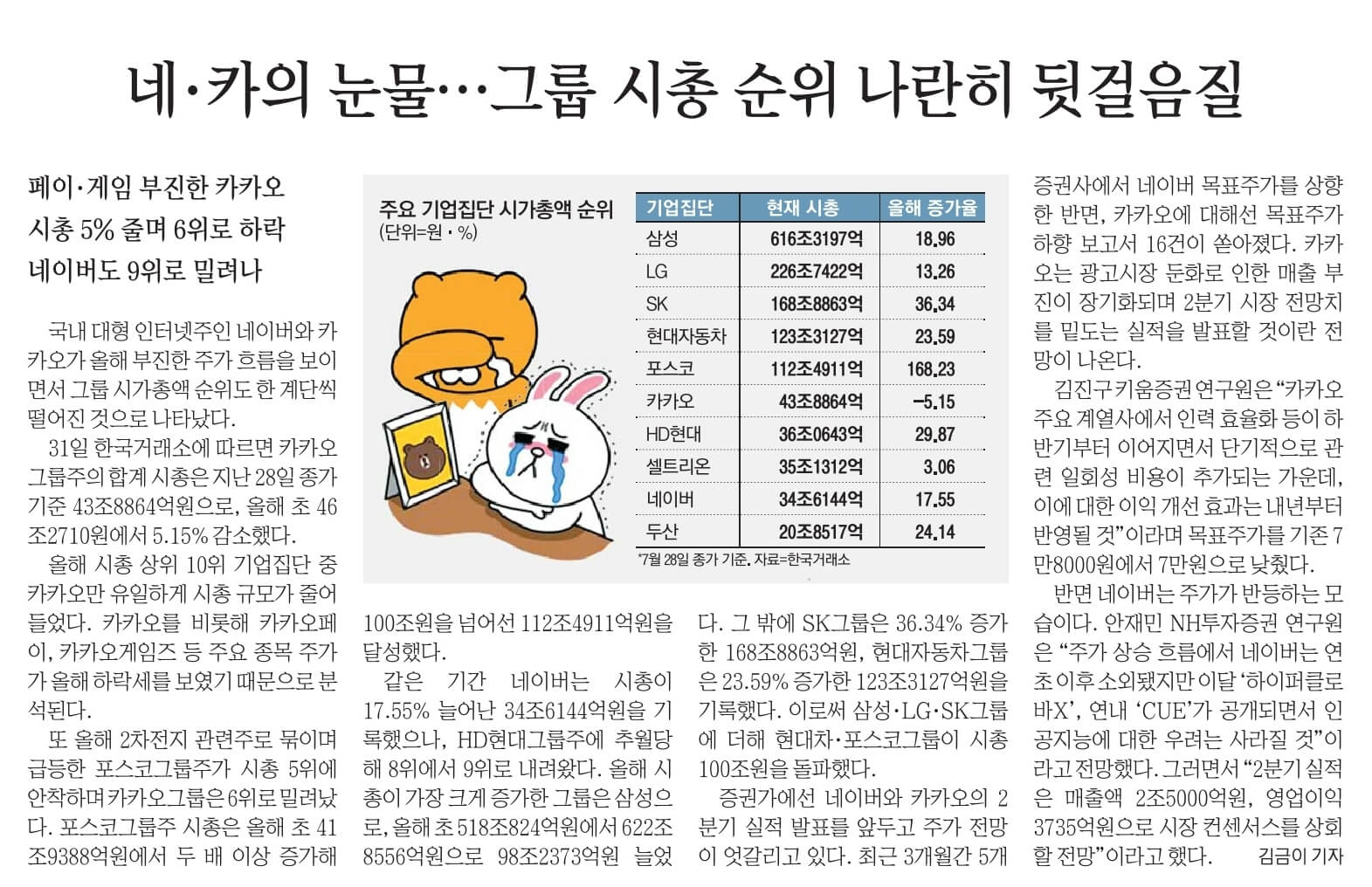 ☞네, 카의 눈물 ... 그룹 시총 순위 나란히 뒷걸음질