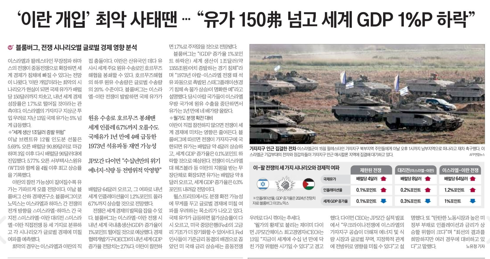 ● 이스라엘과 하마스 간 무력 충돌이 이스라엘-이란전으로 확전할 경우 유가가 배럴당 150달러를 넘어서는 '오일쇼크'가 올 것이라는 전망이 나왔습니다. 내년 세계 경제성장률이 예상치보다 1%포인트 낮아질 수 있다는 예측도 나왔습니다.