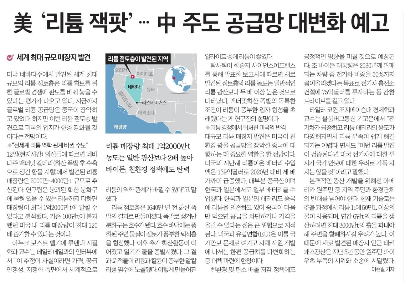 ☞美 '리튬 잭팟' .. 中 주도 공급망 대변화 예고
